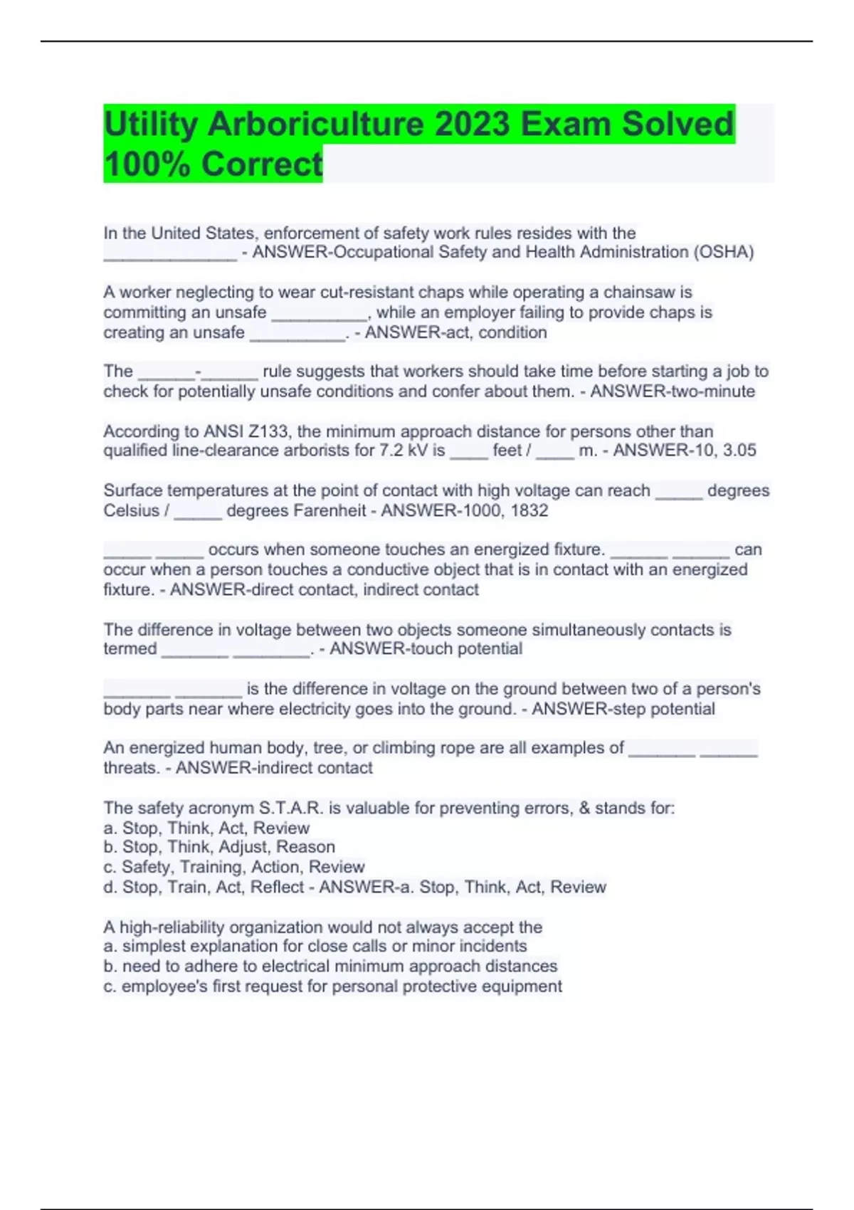 In the United States, enforcement of safety work rules resides with the ______________ - ANSWER-Occupational Safety and Health Administration (OSHA) A worker neglecting to wear cut-resistant chaps while operating a chainsaw is committing an unsafe __________, while an employer failing to provide chaps is creating an unsafe __________. - ANSWER-act, condition The ______-______ rule suggests that workers should take time before starting a job to check for potentially unsafe conditions and confer about them. - ANSWER-two-minute According to ANSI Z133, the minimum approach distance for persons other than qualified line-clearance arborists for 7.2 kV is ____ feet / ____ m. - ANSWER-10, 3.05 Surface temperatures at the point of contact with high voltage can reach _____ degrees Celsius / _____ degrees Farenheit - ANSWER-1000, 1832 _____ _____ occurs when someone touches an energized fixture. ______ ______ can occur when a person touches a conductive object that is in contact with an energized fixture. - ANSWER-direct contact, indirect contact The difference in voltage between two objects someone simultaneously contacts is termed _______ ________. - ANSWER-touch potential _______ _______ is the difference in voltage on the ground between two of a person's body parts near where electricity goes into the ground. - ANSWER-step potential An energized human body, tree, or climbing rope are all examples of _______ ______ threats. - ANSWER-indirect contact The safety acronym S.T.A.R. is valuable for preventing errors, & stands for: a. Stop, Think, Act, Review b. Stop, Think, Adjust, Reason c. Safety, Training, Action, Review d. Stop, Train, Act, Reflect - ANSWER-a. Stop, Think, Act, Review A high-reliability organization would not always accept the a. simplest explanation for close calls or minor incidents b. need to adhere to electrical minimum approach distances c. employee's first request for personal protective equipment