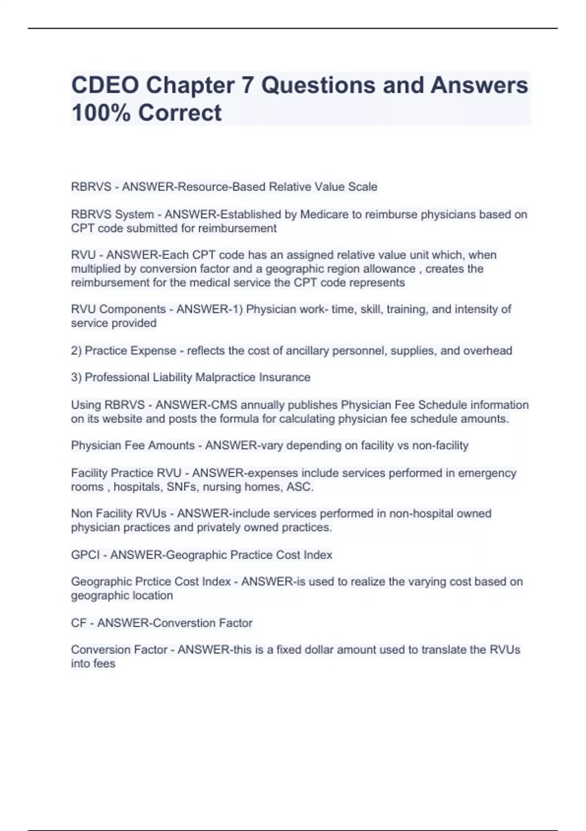 CDEO Chapter 7 Questions and Answers 100% CorrectCDEO Chapter 7 Questions and Answers 100% CorrectCDEO Chapter 7 Questions and Answers 100% CorrectCDEO Chapter 7 Questions and Answers 100% Correct RBRVS - ANSWER-Resource-Based Relative Value Scale RBRVS System - ANSWER-Established by Medicare to reimburse physicians based on CPT code submitted for reimbursement RVU - ANSWER-Each CPT code has an assigned relative value unit which, when multiplied by conversion factor and a geographic region allowance , creates the reimbursement for the medical service the CPT code represents RVU Components - ANSWER-1) Physician work- time, skill, training, and intensity of service provided 2) Practice Expense - reflects the cost of ancillary personnel, supplies, and overhead 3) Professional Liability Malpractice Insurance