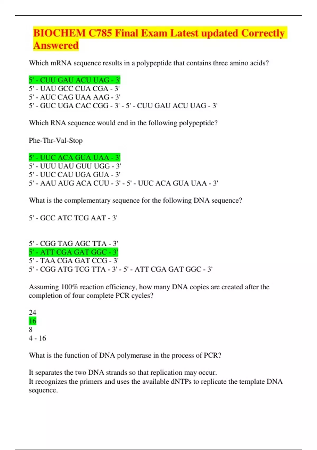 BIOCHEM C785 Final Exam Latest updated Correctly Answered