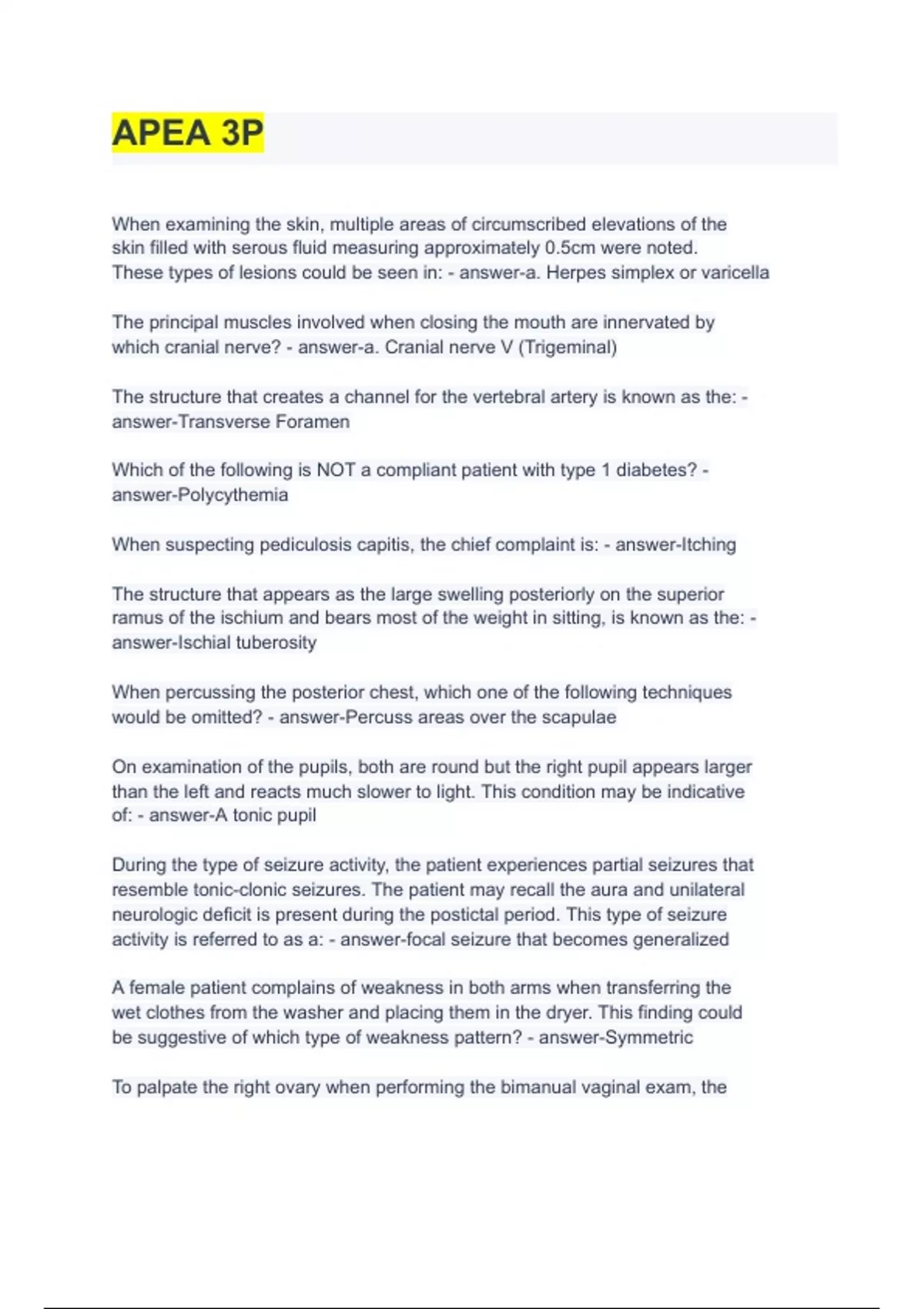 APEA 3P 2023 exam review with 100% full solution When examining the skin, multiple areas of circumscribed elevations of the skin filled with serous fluid measuring approximately 0.5cm were noted. These types of lesions could be seen in: - answer-a. Herpes simplex or varicella The principal muscles involved when closing the mouth are innervated by which cranial nerve? - answer-a. Cranial nerve V (Trigeminal) The structure that creates a channel for the vertebral artery is known as the: - answer-Transverse Foramen