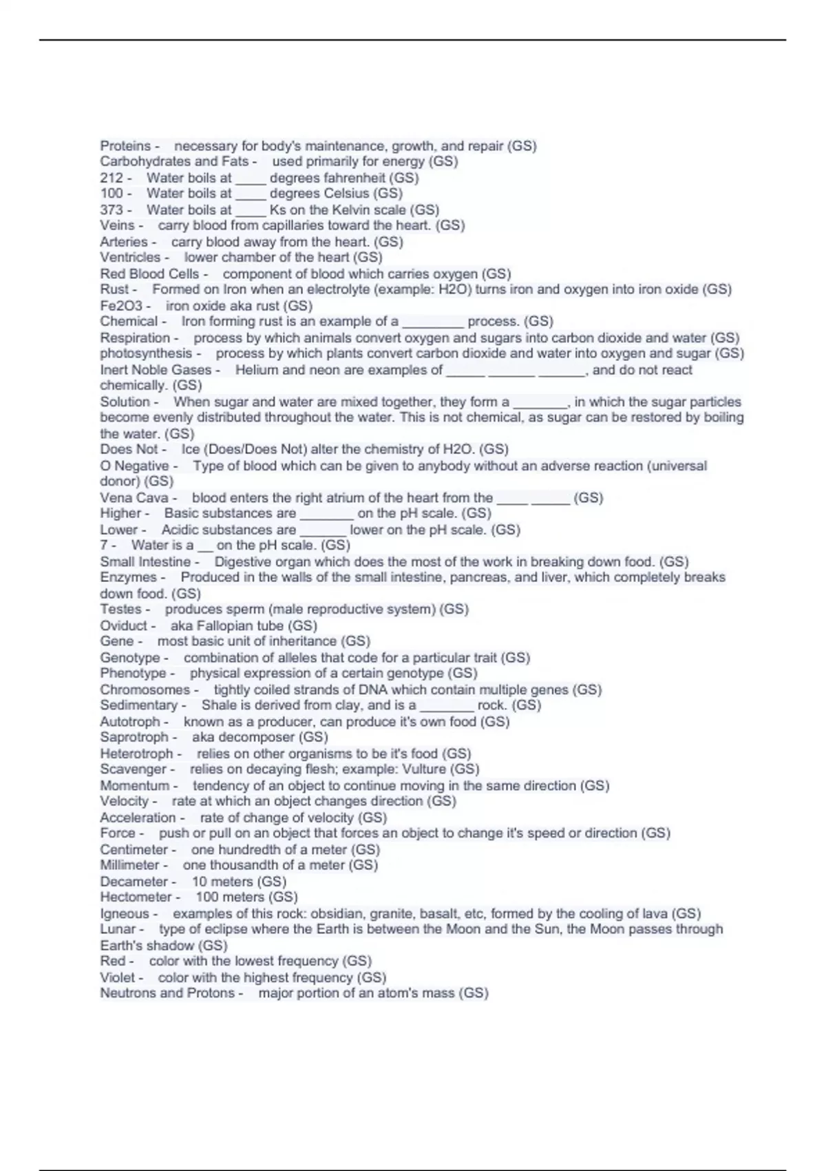 Proteins - necessary for body's maintenance, growth, and repair (GS) Carbohydrates and Fats - used primarily for energy (GS) 212 - Water boils at ____ degrees fahrenheit (GS) 100 - Water boils at ____ degrees Celsius (GS) 373 - Water boils at ____ Ks on the Kelvin scale (GS)