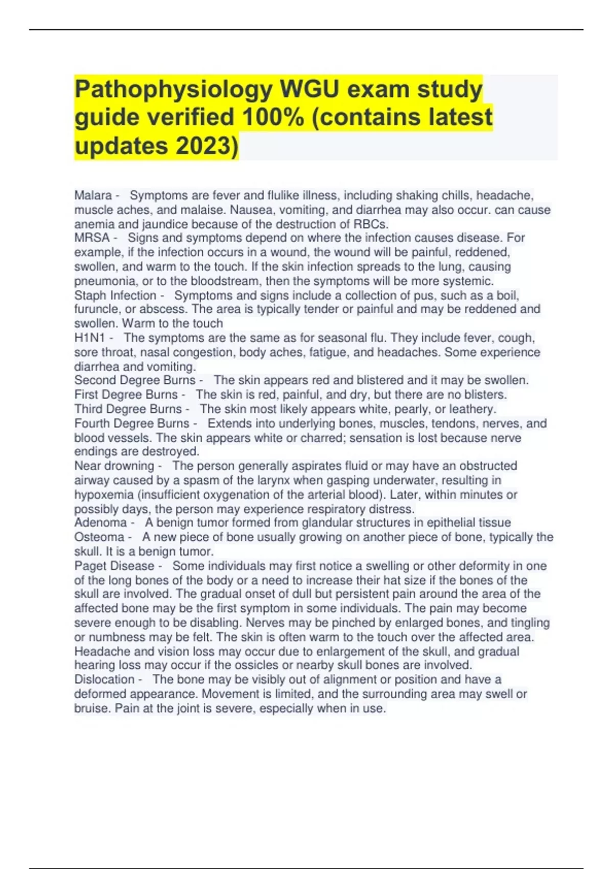Pathophysiology WGU exam study guide verified 100% (contains latest updates 2023) Malara - Symptoms are fever and flulike illness, including shaking chills, headache, muscle aches, and malaise. Nausea, vomiting, and diarrhea may also occur. can cause anemia and jaundice because of the destruction of RBCs. MRSA - Signs and symptoms depend on where the infection causes disease. For example, if the infection occurs in a wound, the wound will be painful, reddened, swollen, and warm to the touch. If the skin infection spreads to the lung, causing pneumonia, or to the bloodstream, then the symptoms will be more systemic. Staph Infection - Symptoms and signs include a collection of pus, such as a boil, furuncle, or abscess. The area is typically tender or painful and may be reddened and swollen. Warm to the touch H1N1 - The symptoms are the same as for seasonal flu. They include fever, cough, sore throat, nasal congestion, body aches, fatigue, and headaches. Some experience diarrhea and vomiting. Second Degree Burns - The skin appears red and blistered and it may be swollen. First Degree Burns - The skin is red, painful, and dry, but there are no blisters. Third Degree Burns - The skin most likely appears white, pearly, or leathery. Fourth Degree Burns - Extends into underlying bones, muscles, tendons, nerves, and blood vessels. The skin appears white or charred; sensation is lost because nerve endings are destroyed. Near drowning - The person generally aspirates fluid or may have an obstructed airway caused by a spasm of the larynx when gasping underwater, resulting in hypoxemia (insufficient oxygenation of the arterial blood). Later, within minutes or possibly days, the person may experience respiratory distress. Adenoma - A benign tumor formed from glandular structures in epithelial tissue Osteoma - A new piece of bone usually growing on another piece of bone, typically the skull. It is a benign tumor. Paget Disease - Some individuals may first notice a swelling or other deformity in one of the long bones of the body or a need to increase their hat size if the bones of the skull are involved. The gradual onset of dull but persistent pain around the area of the affected bone may be the first symptom in some individuals. The pain may become severe enough to be disabling. Nerves may be pinched by enlarged bones, and tingling or numbness may be felt. The skin is often warm to the touch over the affected area. Headache and vision loss may occur due to enlargement of the skull, and gradual hearing loss may occur if the ossicle