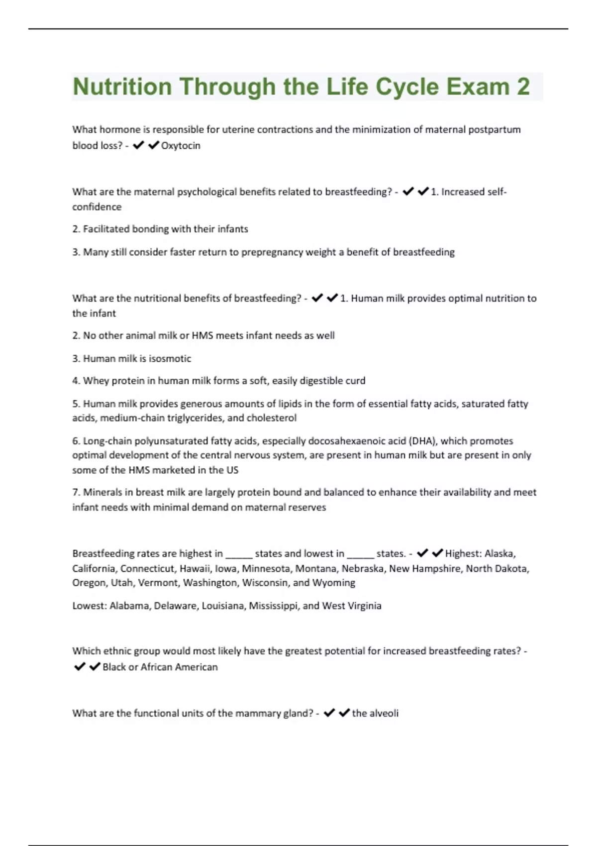 What hormone is responsible for uterine contractions and the minimization of maternal postpartum blood loss? - Oxytocin What are the maternal psychological benefits related to breastfeeding? - 1. Increased selfconfidence 2. Facilitated bonding with their infants 3. Many still consider faster return to prepregnancy weight a benefit of breastfeeding What are the nutritional benefits of breastfeeding? - 1. Human milk provides optimal nutrition to the infant 2. No other animal milk or HMS meets infant needs as well 3. Human milk is isosmotic 4. Whey protein in human milk forms a soft, easily digestible curd 5. Human milk provides generous amounts of lipids in the form of essential fatty acids, saturated fatty acids, medium-chain triglycerides, and cholesterol 6. Long-chain polyunsaturated fatty acids, especially docosahexaenoic acid (DHA), which promotes optimal development of the central nervous system, are present in human milk but are present in only some of the HMS marketed in the US 7. Minerals in breast milk are largely protein bound and balanced to enhance their availability and meet infant needs with minimal demand on maternal reserves Breastfeeding rates are highest in _____ states and lowest in _____ states. - Highest: Alaska, California, Connecticut, Hawaii, Iowa, Minnesota, Montana, Nebraska, New Hampshire, North Dakota, Oregon, Utah, Vermont, Washington, Wisconsin, and Wyoming Lowest: Alabama, Delaware, Louisiana, Mississippi, and West Virginia Which ethnic group would most likely have the greatest potential for increased breastfeeding rates? - Black or African American What are the functional units of the mammary gland? - the alveoliWhat hormone is necessary for the let-down reflex? - Oxytocin Control of the amount of milk produced is regulated by _____. - Prolactin