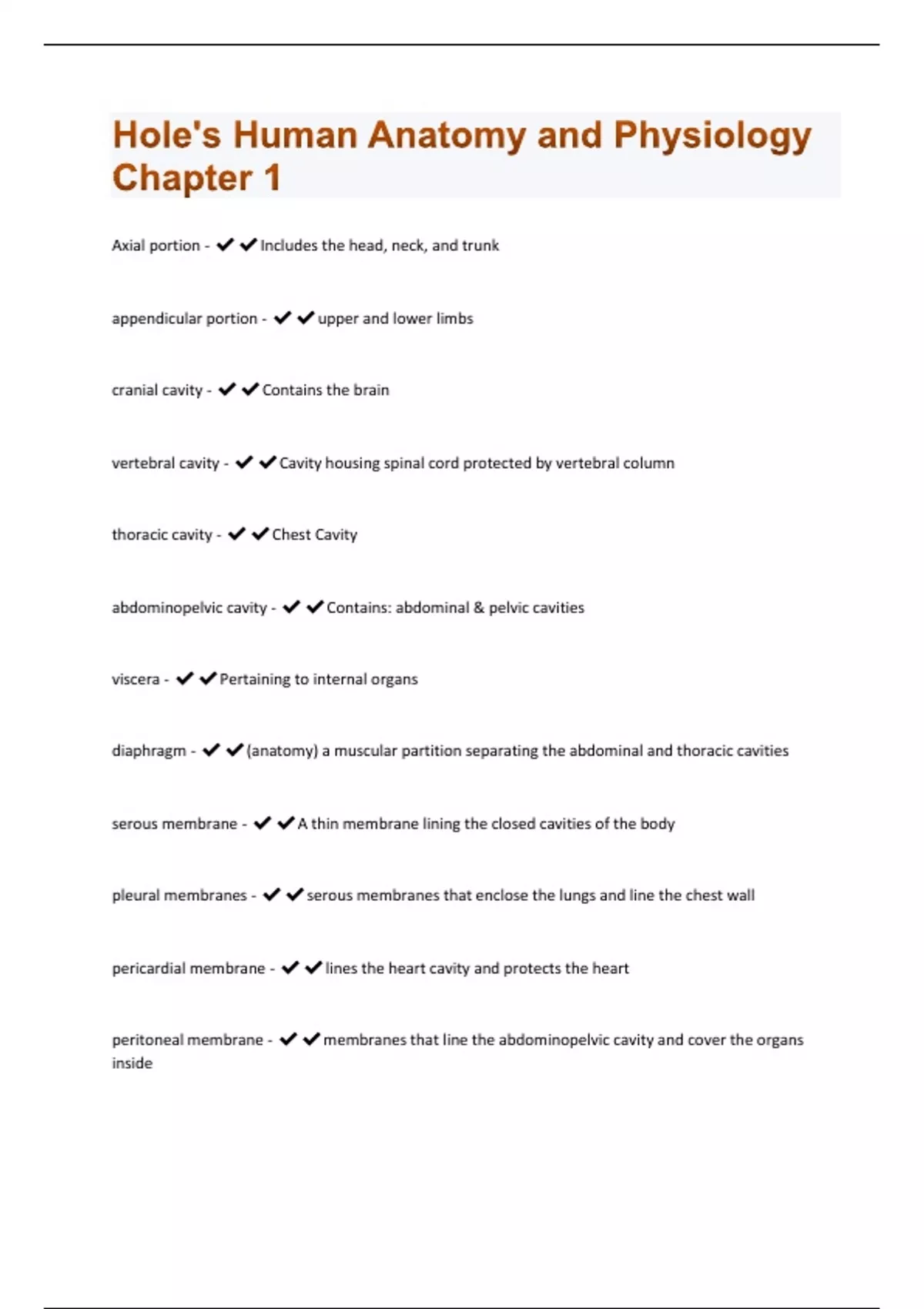 Axial portion - Includes the head, neck, and trunk appendicular portion - upper and lower limbs cranial cavity - Contains the brain vertebral cavity - Cavity housing spinal cord protected by vertebral column thoracic cavity - Chest Cavity abdominopelvic cavity - Contains: abdominal & pelvic cavities viscera - Pertaining to internal organs diaphragm - (anatomy) a muscular partition separating the abdominal and thoracic cavities serous membrane - A thin membrane lining the closed cavities of the body pleural membranes - serous membranes that enclose the lungs and line the chest wall pericardial membrane - lines the heart cavity and protects the heart peritoneal membrane - membranes that line the abdominopelvic cavity and cover the organs insideintegumentary system - Consists of the skin, mucous membranes, hair, and nail skeletal system - 1. Function- to provide support for the body, to protect delicate internal organs and to provide attachment sites for the organ muscular system - Consists of skeletal muscles, tendons that connect muscles to bones, and ligaments that attach bones together to form joint endocrine system - Glands secrete hormones that regulate processes such as growth, reproduction, and nutrient use (metabolism) by body cells. cardiovascular system - Blood vessels transport blood, which carries oxygen, carbon dioxide, nutrients, wastes, etc. The heart pumps blood. lymphatic system - Composed of red bone marrow, thymus, spleen, lymph nodes, lymphatic vessels; picks up fluid leaked from blood vessels and returns it to the blood; Involved with immunity; Without the system, the body would swell ad fluid becomes trapped in your tissues digestive system - Breaks down food into absorbable units that enter the blood for distribution to body cells. respiratory system - A system of organs, functioning in the process of gas exchange between the body and the environment, consisting especially of the nose, nasal passages, nasopharynx, larynx, trachea, bronchi, and lungs. urinary system - Eliminates nitrogenous wastes from the body. Regulates water, electrolyte and acid-base balance of the blood. superior - a part above another part inferior - a part below another part