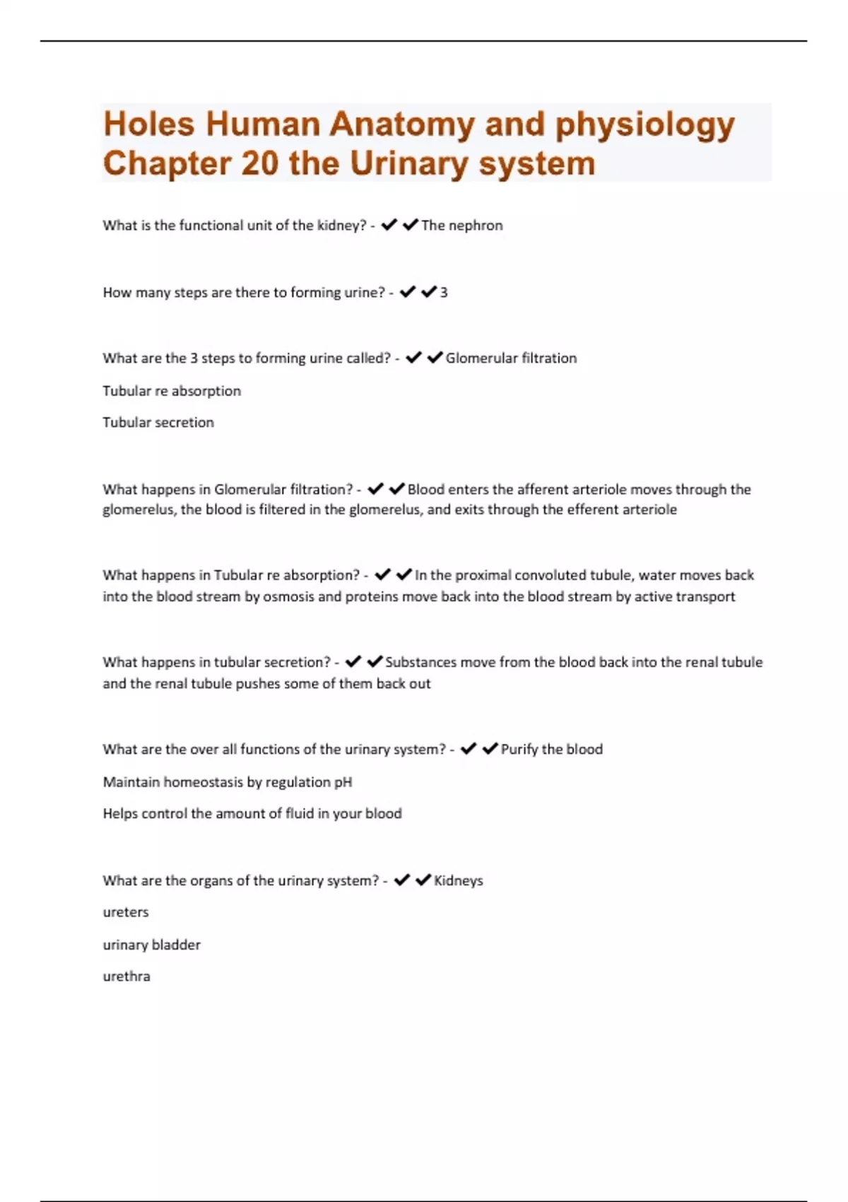 Holes Human Anatomy and physiology Chapter 20 the Urinary system | 61 Questions and Answers(A+ Solution guide)