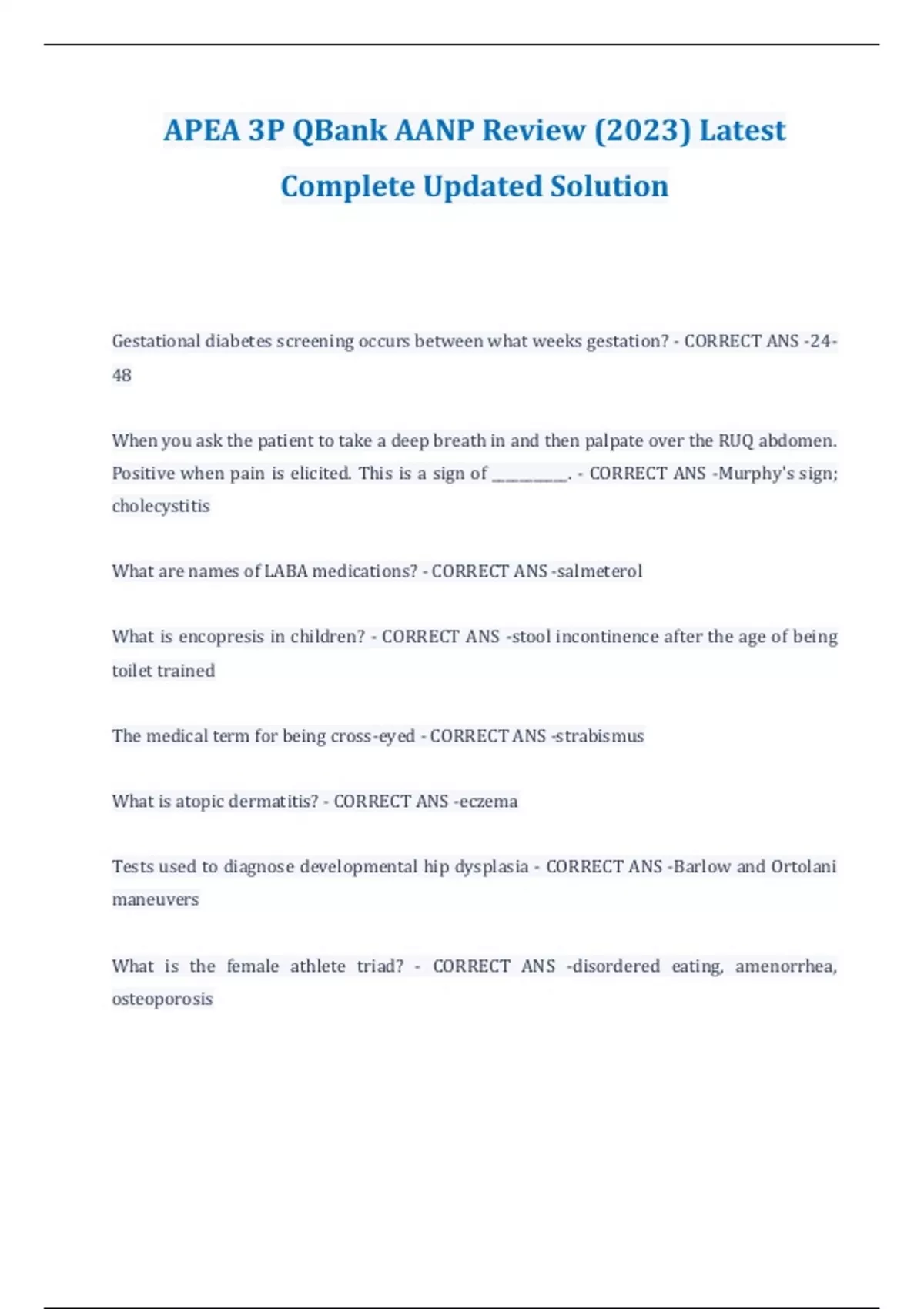 APEA 3P QBank AANP Review (2023) Latest Complete Updated Solution Gestational diabetes screening occurs between what weeks gestation? - CORRECT ANS -24-48 When you ask the patient to take a deep breath in and then palpate over the RUQ abdomen. Positive when pain is elicited. This is a sign of ___________. - CORRECT ANS -Murphy's sign; cholecystitis What are names of LABA medications? - CORRECT ANS -salmeterol What is encopresis in children? - CORRECT ANS -stool incontinence after the age of being toilet trained The medical term for being cross-eyed - CORRECT ANS -strabismus What is atopic dermatitis? - CORRECT ANS -eczema Tests used to diagnose developmental hip dysplasia - CORRECT ANS -Barlow and Ortolani maneuvers What is the female athlete triad? - CORRECT ANS -disordered eating, amenorrhea, osteoporosis How do patients with aortic regurgitation typically present? - CORRECT ANS -they will have a long asymptomatic period followed by exercise intolerance, then dyspnea at rest. The left ventricle eventually fails unless the aortic valve is replaced. What does the rash of fifth disease (a viral exanthem) look like? - CORRECT ANS -maculopapular rash that blanches easily and may be accompanied by joint aches