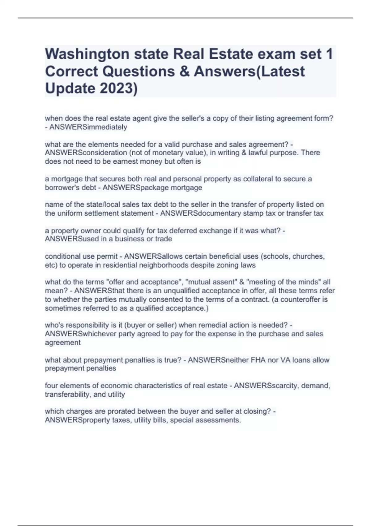 Washington state Real Estate exam set 1 Correct Questions & Answers(Latest Update 2023