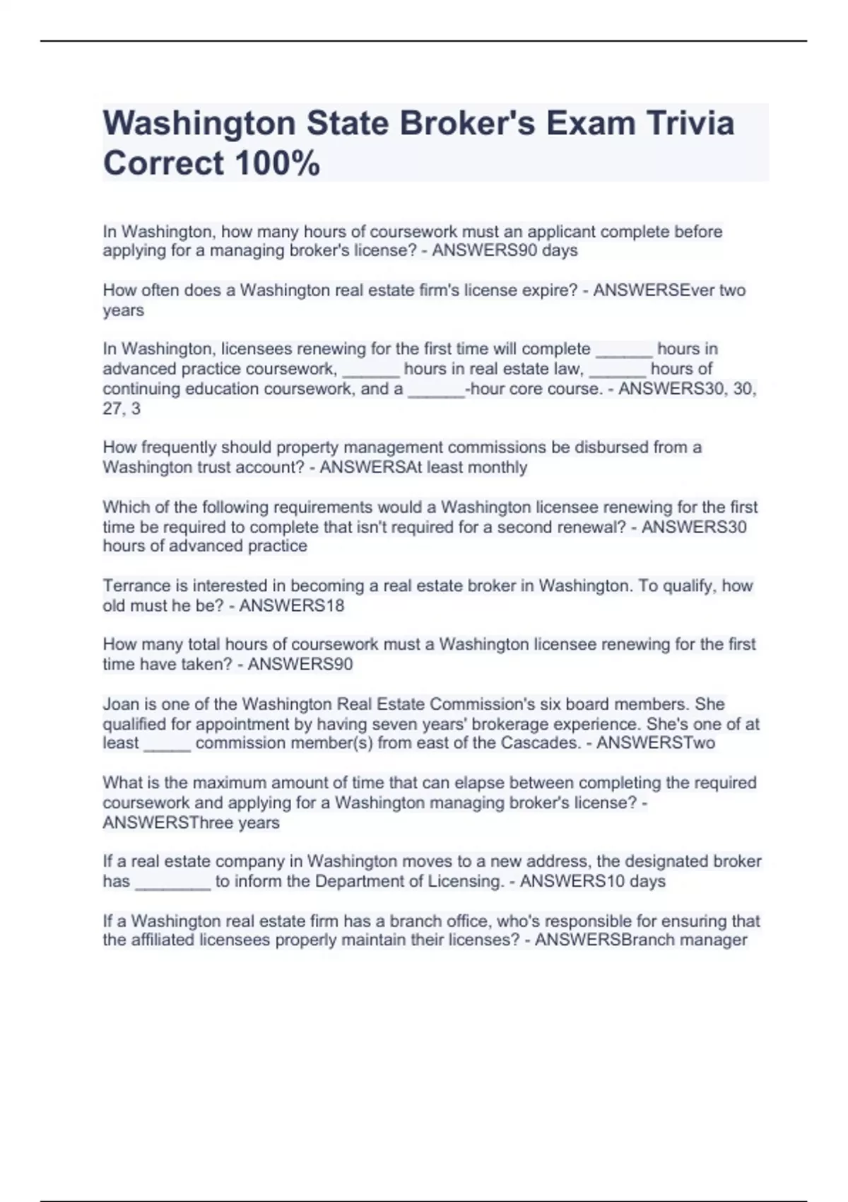 In Washington, how many hours of coursework must an applicant complete before applying for a managing broker's license? - ANSWERS90 days How often does a Washington real estate firm's license expire? - ANSWERSEver two years In Washington, licensees renewing for the first time will complete ______ hours in advanced practice coursework, ______ hours in real estate law, ______ hours of continuing education coursework, and a ______-hour core course. - ANSWERS30, 30, 27, 3 How frequently should property management commissions be disbursed from a Washington trust account? - ANSWERSAt least monthly Which of the following requirements would a Washington licensee renewing for the first time be required to complete that isn't required for a second renewal? - ANSWERS30 hours of advanced practice Terrance is interested in becoming a real estate broker in Washington. To qualify, how old must he be? - ANSWERS18 How many total hours of coursework must a Washington licensee renewing for the first time have taken? - ANSWERS90 Joan is one of the Washington Real Estate Commission's six board members. She qualified for appointment by having seven years' brokerage experience. She's one of at least _____ commission member(s) from east of the Cascades. - ANSWERSTwo What is the maximum amount of time that can elapse between completing the required coursework and applying for a Washington managing broker's license? - ANSWERSThree years If a real estate company in Washington moves to a new address, the designated broker has ________ to inform the Department of Licensing. - ANSWERS10 days If a Washington real estate firm has a branch office, who's responsible for ensuring that the affiliated licensees properly maintain their licenses? - ANSWERSBranch manag