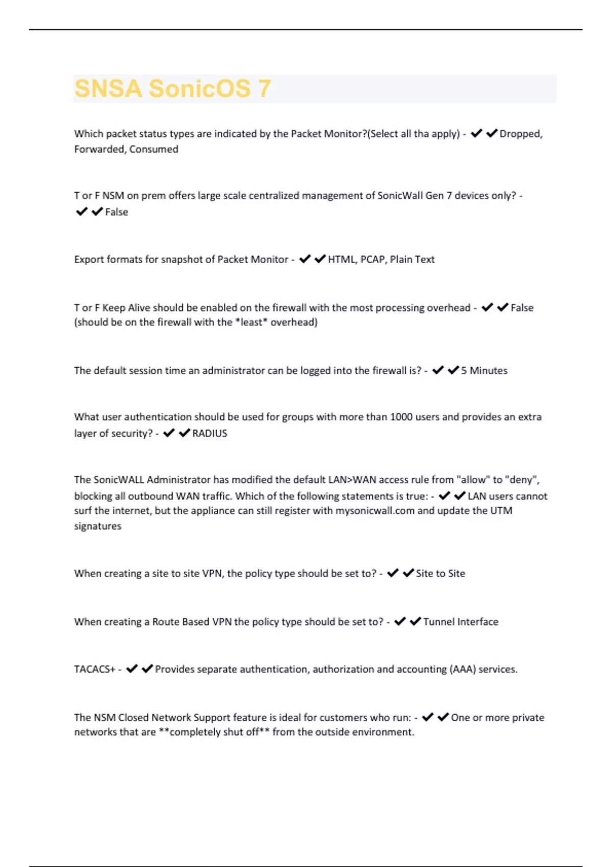 Which packet status types are indicated by the Packet Monitor?(Select all tha apply) - Dropped, Forwarded, Consumed T or F NSM on prem offers large scale centralized management of SonicWall Gen 7 devices only? - False Export formats for snapshot of Packet Monitor - HTML, PCAP, Plain Text T or F Keep Alive should be enabled on the firewall with the most processing overhead - False (should be on the firewall with the *least* overhead) The default session time an administrator can be logged into the firewall is? - 5 Minutes What user authentication should be used for groups with more than 1000 users and provides an extra layer of security? - RADIUS The SonicWALL Administrator has modified the default LAN>WAN access rule from "allow" to "deny", blocking all outbound WAN traffic. Which of the following statements is true: - LAN users cannot surf the internet, but the appliance can still register with and update the UTM signatures When creating a site to site VPN, the policy type should be set to? - Site to Site When creating a Route Based VPN the policy type should be set to? - Tunnel Interface TACACS+ - Provides separate authentication, authorization and accounting (AAA) services. The NSM Closed Network Support feature is ideal for customers who run: - One or more private networks that are **completely shut off** from the outside environment.T or F NSM On-Prem requires a separate license for the reporting and analytics features - True T or F Setting the Event Priority level lower than the Logging Level will cause those events to be filtered out from Event Logs. - True If the Logging Level Filter is defined as Error, which of the following alert messages will also be displayed in the results? (Select all that apply) - Emergency, Alert, Critical