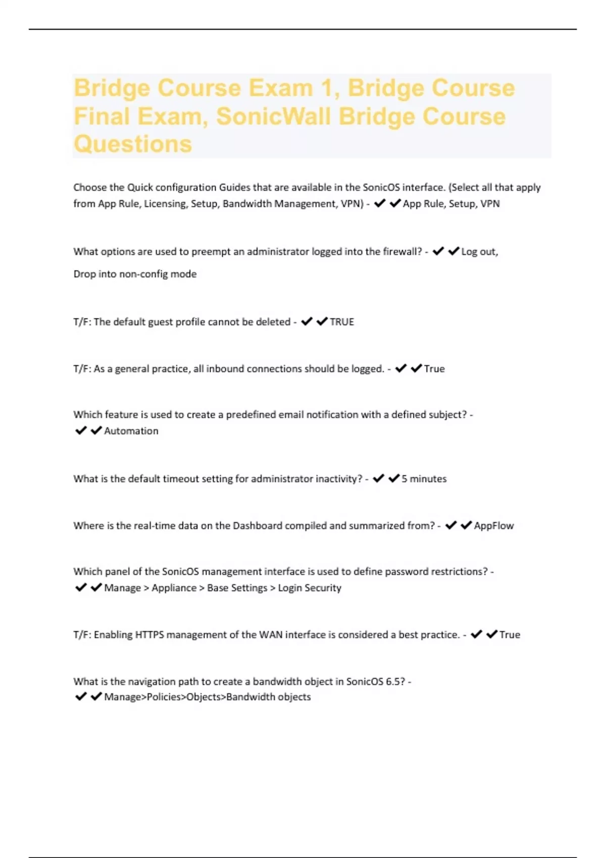 Bridge Course Exam 1, Bridge Course Final Exam, SonicWall Bridge Course Questions Rated 100% Correct!!