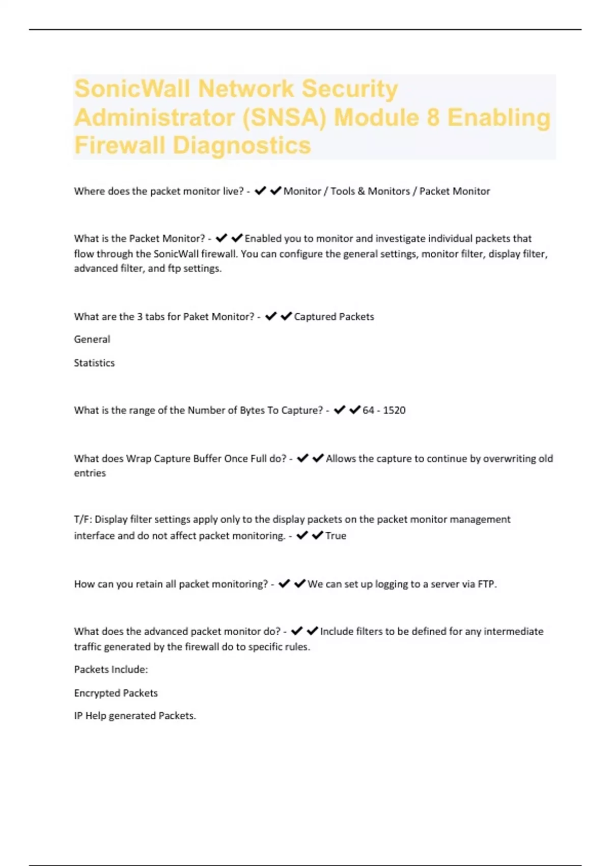 SonicWall Network Security Administrator (SNSA) Module 8 Enabling Firewall Diagnostics Exam Questions With Complete Solutions.