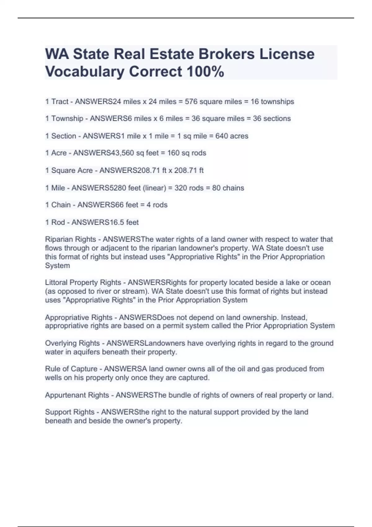 1 Tract - ANSWERS24 miles x 24 miles = 576 square miles = 16 townships 1 Township - ANSWERS6 miles x 6 miles = 36 square miles = 36 sections 1 Section - ANSWERS1 mile x 1 mile = 1 sq mile = 640 acres 1 Acre - ANSWERS43,560 sq feet = 160 sq rods 1 Square Acre - ANSWERS208.71 ft x 208.71 ft 1 Mile - ANSWERS5280 feet (linear) = 320 rods = 80 chains 1 Chain - ANSWERS66 feet = 4 rods 1 Rod - ANSWERS16.5 feet Riparian Rights - ANSWERSThe water rights of a land owner with respect to water that flows through or adjacent to the riparian landowner's property. WA State doesn't use this format of rights but instead uses "Appropriative Rights" in the Prior Appropriation System Littoral Property Rights - ANSWERSRights for property located beside a lake or ocean (as opposed to river or stream). WA State doesn't use this format of rights but instead uses "Appropriative Rights" in the Prior Appropriation System Appropriative Rights - ANSWERSDoes not depend on land ownership. Instead, appropriative rights are based on a permit system called the Prior Appropriation System Overlying Rights - ANSWERSLandowners have overlying rights in regard to the ground water in aquifers beneath their property. Rule of Capture - ANSWERSA land owner owns all of the oil and gas produced from wells on his property only once they are captured. Appurtenant Rights - ANSWERSThe bundle of rights of owners of real property or land. Support Rights - ANSWERSthe right to the natural support provided by the land beneath and beside the owner's property. Lateral Support - ANSWERSsupport from the adjacent