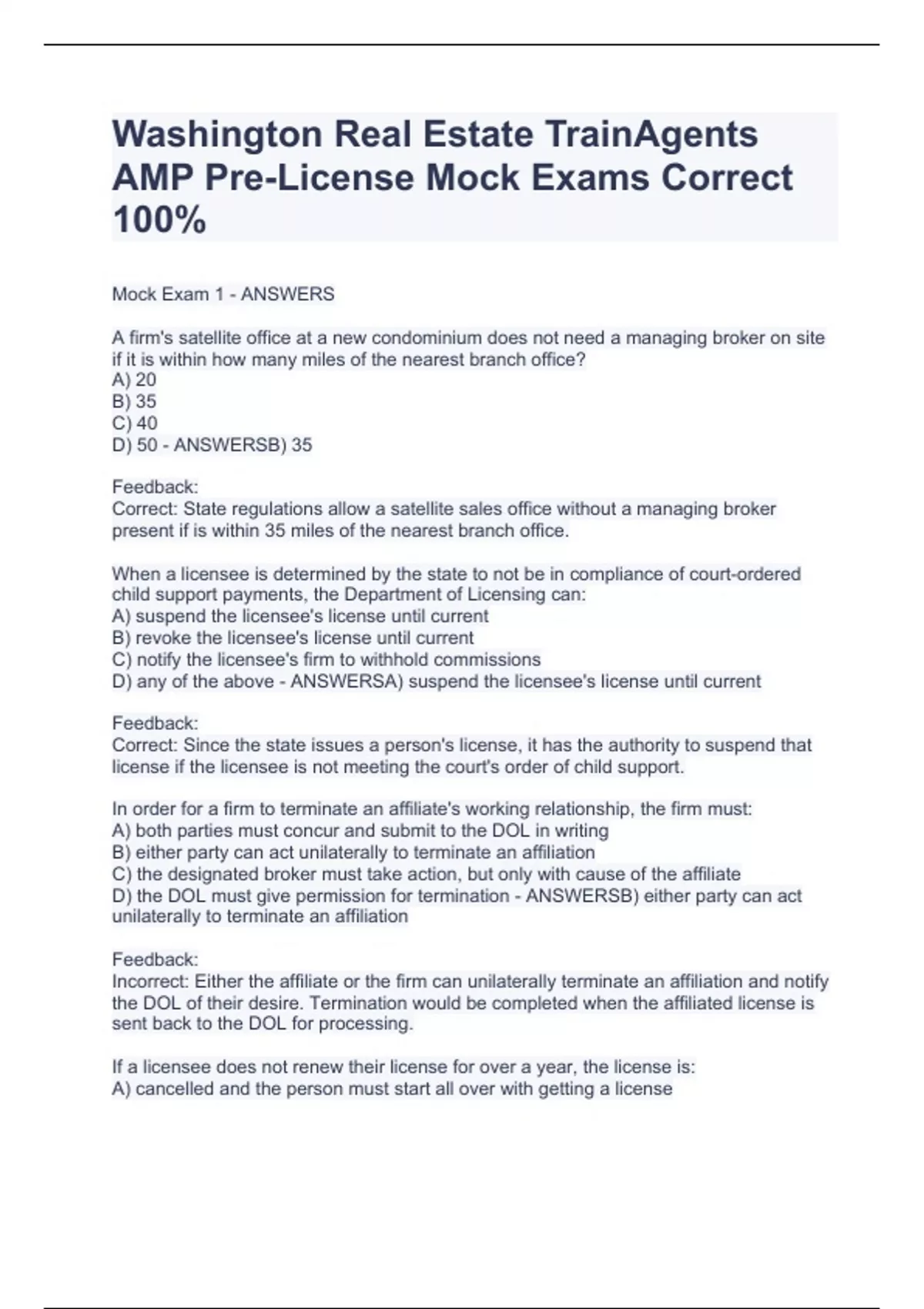 Mock Exam 1 - ANSWERS A firm's satellite office at a new condominium does not need a managing broker on site if it is within how many miles of the nearest branch office? A) 20 B) 35 C) 40 D) 50 - ANSWERSB) 35 Feedback: Correct: State regulations allow a satellite sales office without a managing broker present if is within 35 miles of the nearest branch office. When a licensee is determined by the state to not be in compliance of court-ordered child support payments, the Department of Licensing can: A) suspend the licensee's license until current B) revoke the licensee's license until current C) notify the licensee's firm to withhold commissions D) any of the above - ANSWERSA) suspend the licensee's license until current Feedback: Correct: Since the state issues a person's license, it has the authority to suspend that license if the licensee is not meeting the court's order of child support. In order for a firm to terminate an affiliate's working relationship, the firm must: A) both parties must concur and submit to the DOL in writing B) either party can act unilaterally to terminate an affiliation C) the designated broker must take action, but only with cause of the affiliate D) the DOL must give permission for termination - ANSWERSB) either party can act unilaterally to terminate an affiliation Feedback: Incorrect: Either the affiliate or the firm can unilaterally terminate an affiliation and notify the DOL of their desire. Termination would be completed when the affiliated license is sent back to the DOL for processing. If a licensee does not renew their license for over a year, the license is: A) cancelled and the person must start all over with ge