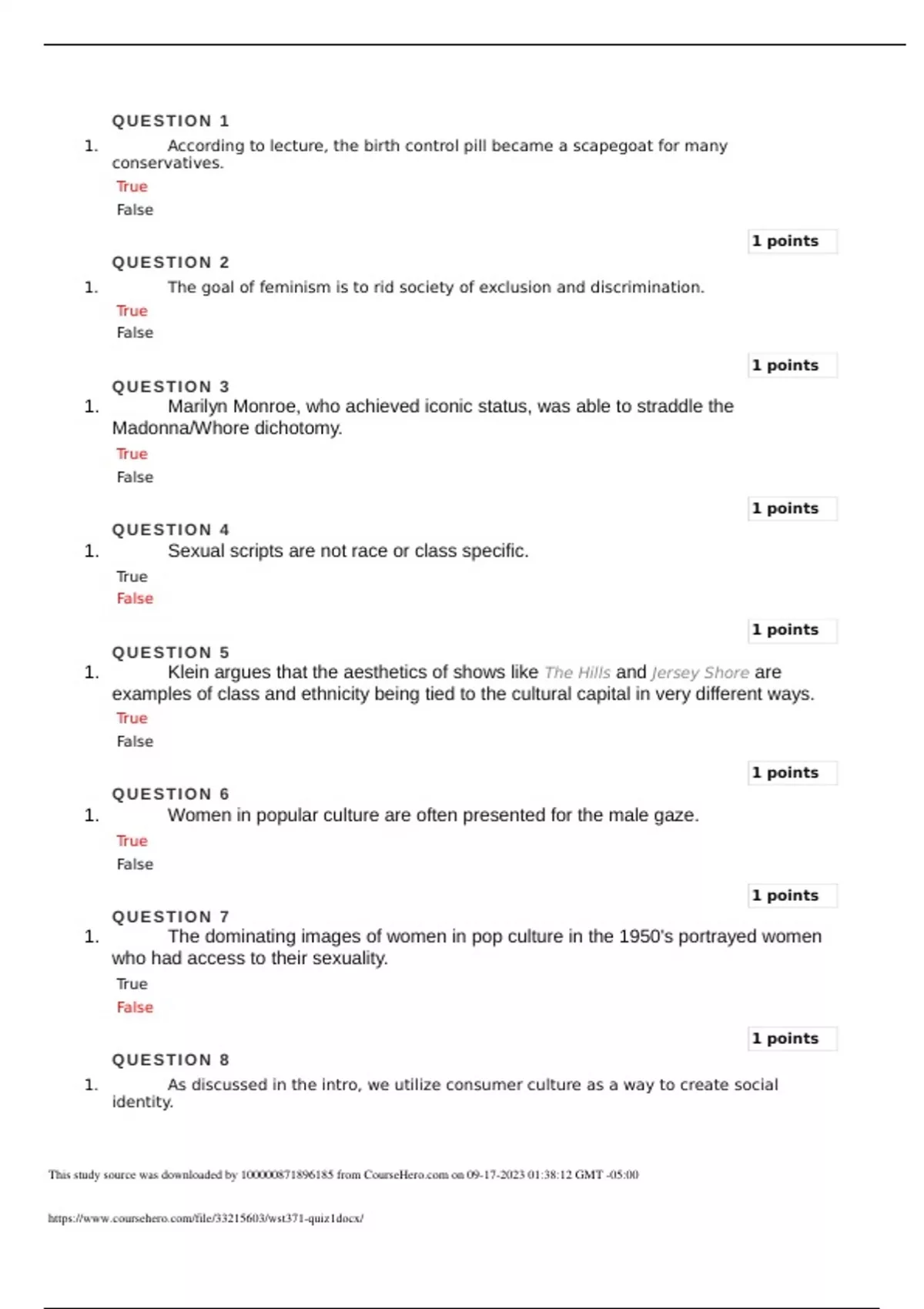QUESTION 1 1. According to lecture, the birth control pill became a scapegoat for many conservatives. True False 1 points QUESTION 2 1. The goal of feminism is to rid society of exclusion and discrimination. True False 1 points QUESTION 3 1. Marilyn Monroe, who achieved iconic status, was able to straddle the Madonna/Whore dichotomy. True False
