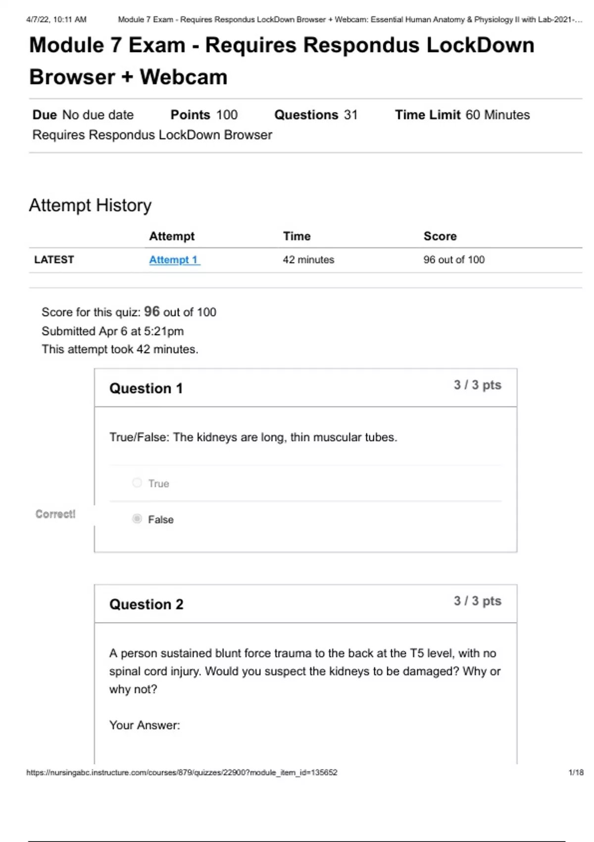 True/False: The kidneys are long, thin muscular tubes. True False Correct! Ques 3 / 3 pts tion 2 Your Answer: A person sustained blunt force trauma to the back at the T5 level, with no spinal cord injury. Would you suspect the kidneys to be damaged? Why or why not? 4/7/22, 10:11 AM Module 7 Exam - Requires Respondus LockDown Browser + Webcam: Essential Human Anatomy & Physiology II with Lab-2021-… No, the kidneys would not be damaged because they lie between the T12- L3 vertebrae No, the kidneys lie between the T-12 and L-3