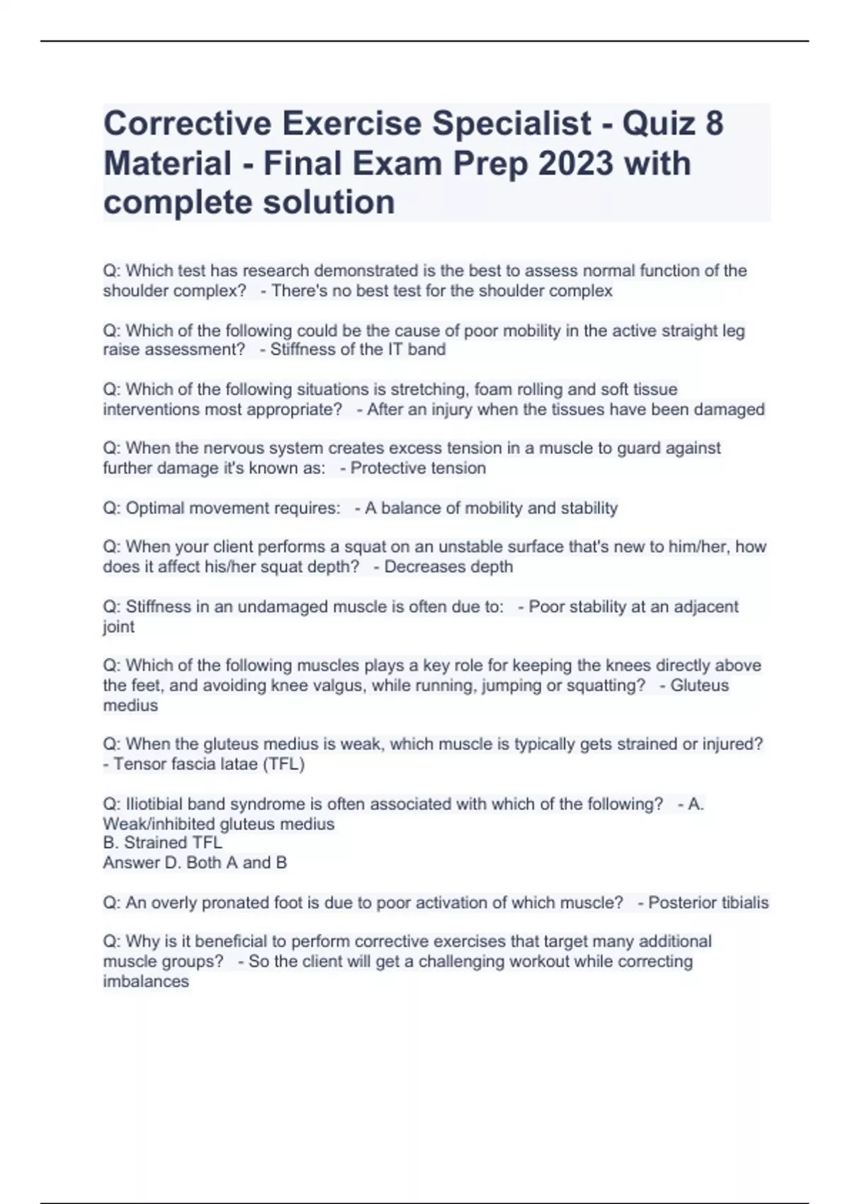 Corrective Exercise Specialist - Quiz 8 Material - Final Exam Prep 2023 with complete solution