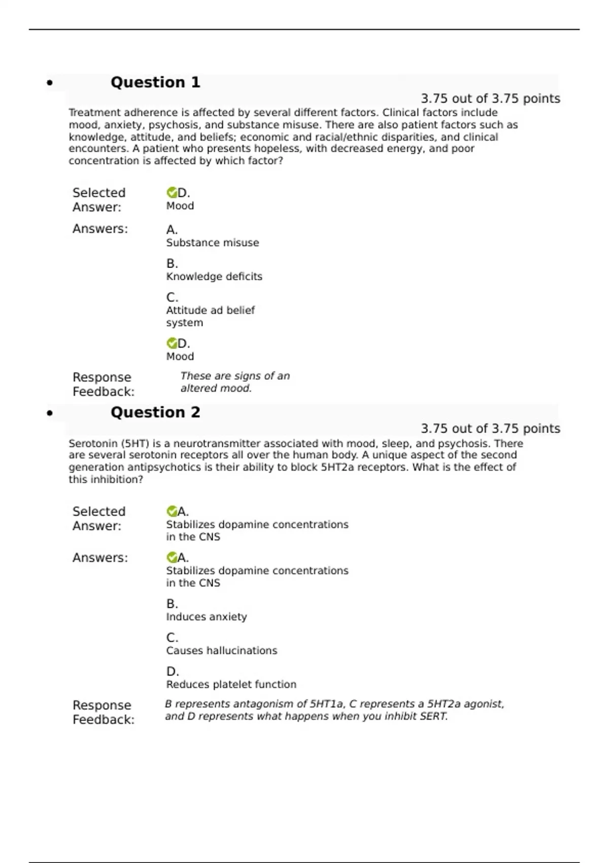 Treatment adherence is affected by several different factors. Clinical factors include mood, anxiety, psychosis, and substance misuse. There are also patient factors such as knowledge, attitude, and beliefs; economic and racial/ethnic disparities, and clinical encounters. A patient who presents hopeless, with decreased energy, and poor concentration is affected by which factor? Selected Answer: D. Mood Answers: A. Substance misuse B. Knowledge deficits C. Attitude ad belief system D. Mood Response Feedback: These are signs of an altered mood. Question 2 3.75 out of 3.75 points Serotonin (5HT) is a neurotransmitter associated with mood, sleep, and psychosis. There are several serotonin receptors all over the human body. A unique aspect of the second generation antipsychotics is their ability to block 5HT2a receptors. What is the effect of this inhibition? Selected Answer: A. Stabilizes dopamine concentrations in the CNS