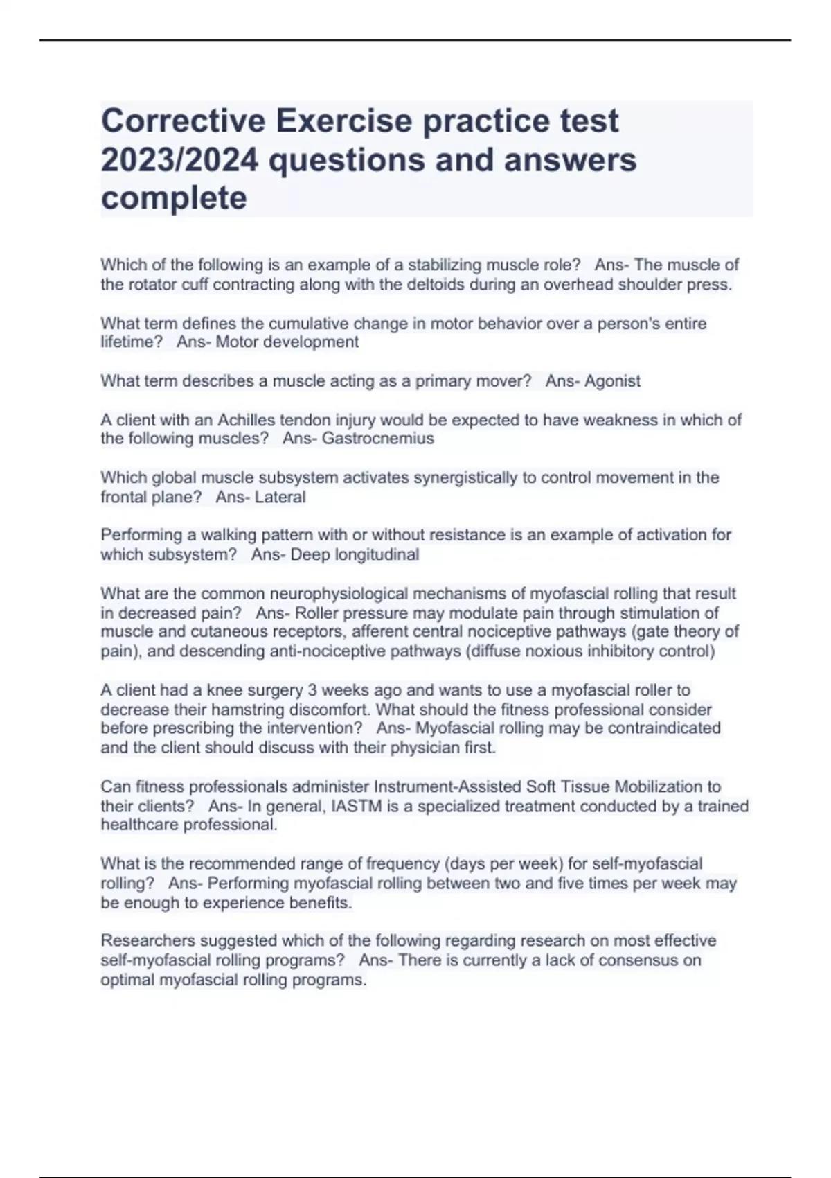 Corrective Exercise practice test 2023/2024 questions and answers complete