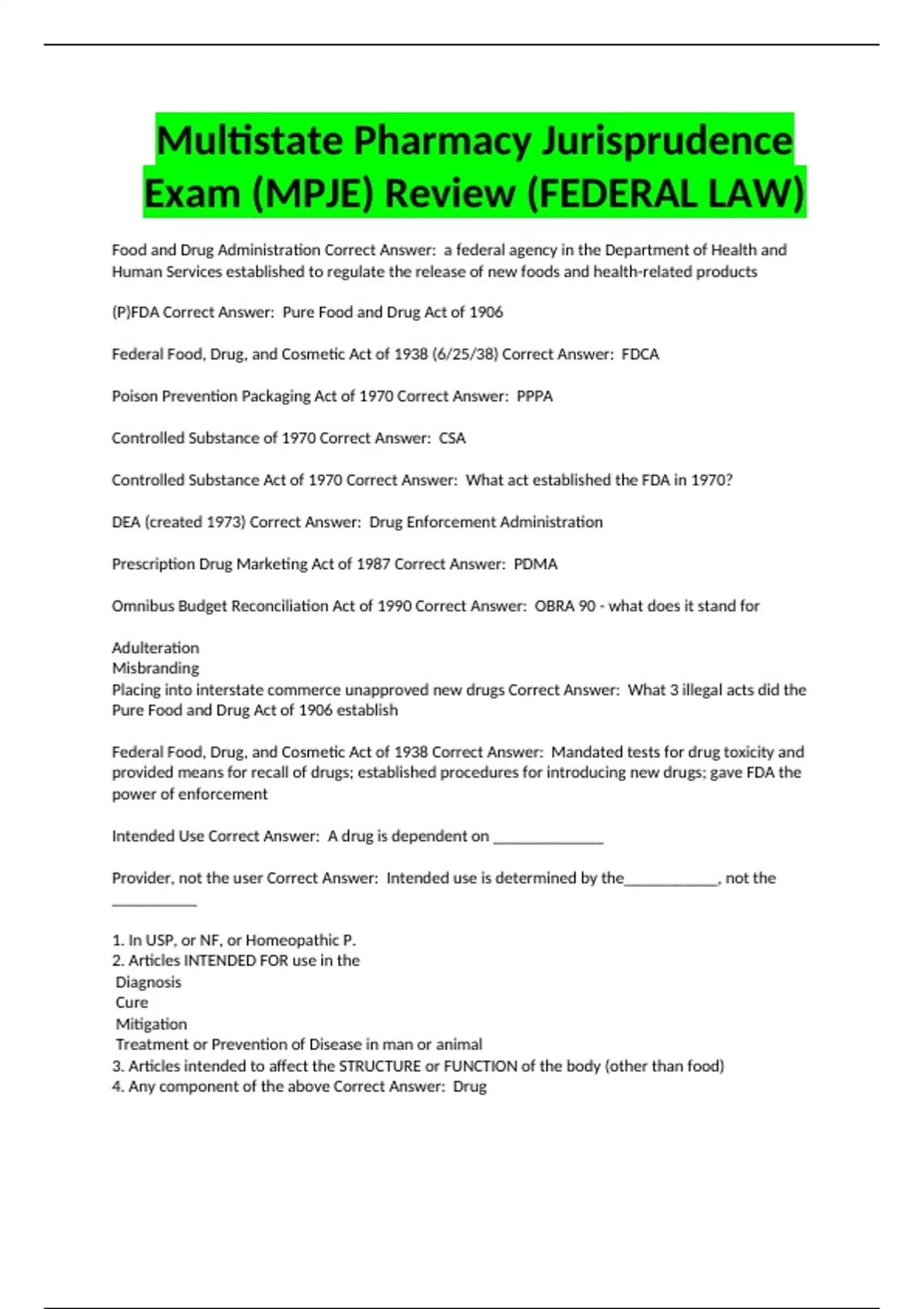 Food and Drug Administration Correct Answer: a federal agency in the Department of Health and Human Services established to regulate the release of new foods and health-related products (P)FDA Correct Answer: Pure Food and Drug Act of 1906 Federal Food, Drug, and Cosmetic Act of 1938 (6/25/38) Correct Answer: FDCA Poison Prevention Packaging Act of 1970 Correct Answer: PPPA Controlled Substance of 1970 Correct Answer: CSA Controlled Substance Act of 1970 Correct Answer: What act established the FDA in 1970? DEA (created 1973) Correct Answer: Drug Enforcement Administration Prescription Drug Marketing Act of 1987 Correct Answer: PDMA Omnibus Budget Reconciliation Act of 1990 Correct Answer: OBRA 90 - what does it stand for Adulteration Misbranding Placing into interstate commerce unapproved new drugs Correct Answer: What 3 illegal acts did the Pure Food and Drug Act of 1906 establish Federal Food, Drug, and Cosmetic Act of 1938 Correct Answer: Mandated tests for drug toxicity and provided means for recall of drugs; established procedures for introducing new drugs; gave FDA the power of enforcement Intended Use Correct Answer: A drug is dependent on _____________ Provider, not the user Correct Answer: Intended use is determined by the___________, not the __________