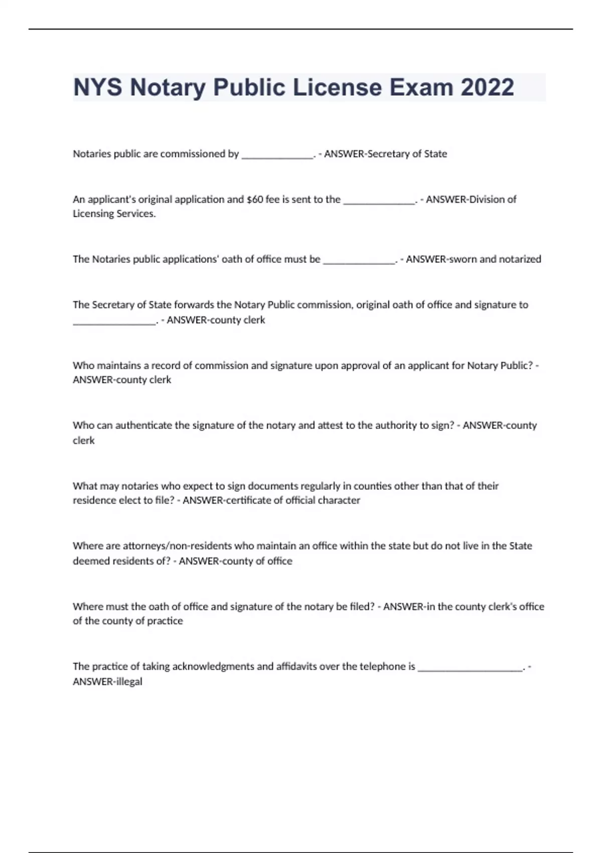 NYS Notary Public License Exam 2022 Notaries public are commissioned by _____________. - ANSWER-Secretary of State An applicant's original application and $60 fee is sent to the _____________. - ANSWER-Division of Licensing Services. The Notaries public applications' oath of office must be _____________. - ANSWER-sworn and notarized The Secretary of State forwards the Notary Public commission, original oath of office and signature to _______________. - ANSWER-county clerk Who maintains a record of commission and signature upon approval of an applicant for Notary Public? - ANSWER-county clerk Who can authenticate the signature of the notary and attest to the authority to sign? - ANSWER-county clerk What may notaries who expect to sign documents regularly in counties other than that of their residence elect to file? - ANSWER-certificate of official character Where are attorneys/non-residents who maintain an office within the state but do not live in the State deemed residents of? - ANSWER-county of office Where must the oath of office and signature of the notary be filed? - ANSWER-in the county clerk's office of the county of practice The practice of taking acknowledgments and affidavits over the telephone is ___________________. - ANSWER-illegal