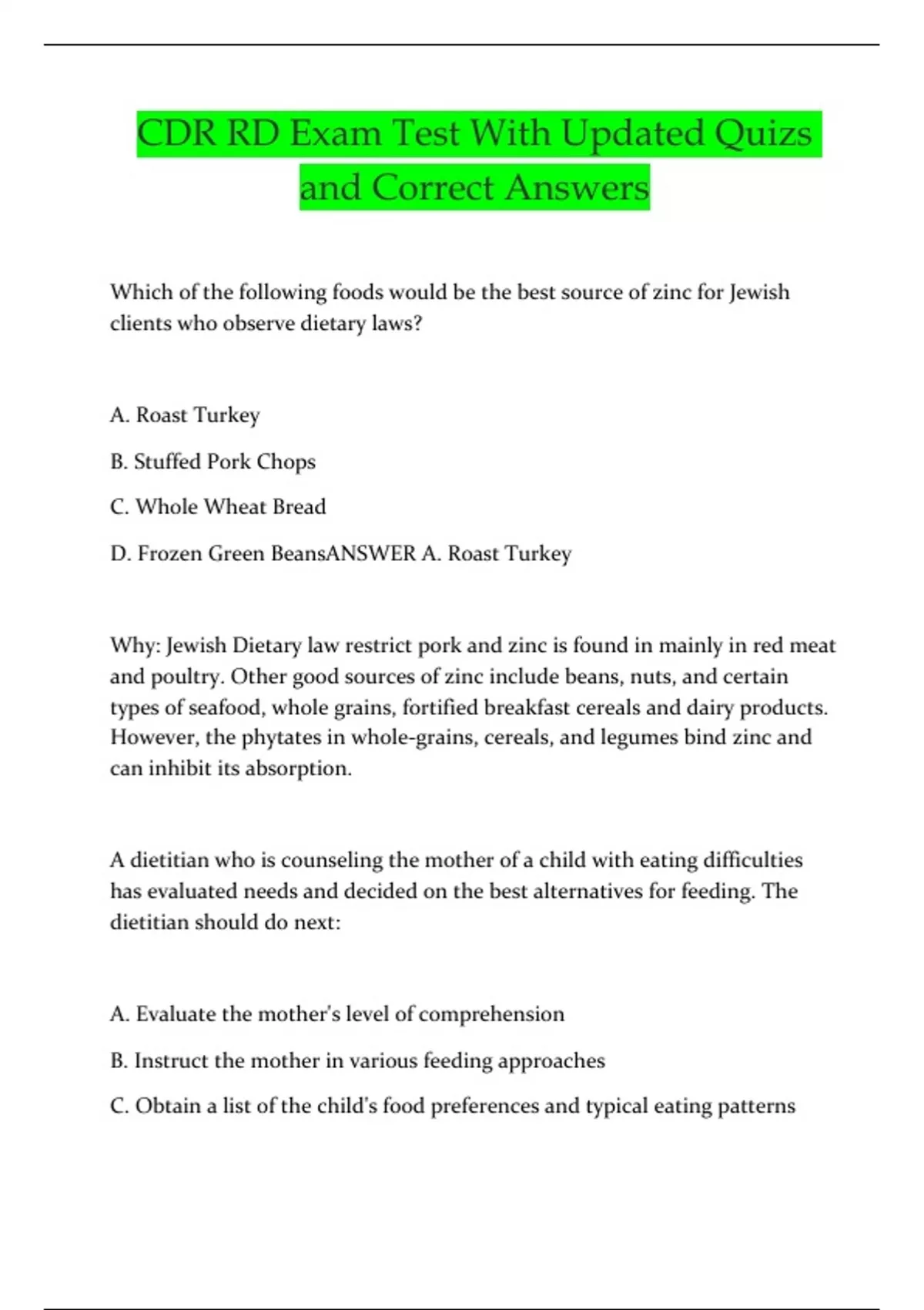Which of the following foods would be the best source of zinc for Jewish clients who observe dietary laws? A. Roast Turkey B. Stuffed Pork Chops C. Whole Wheat Bread D. Frozen Green BeansANSWER A. Roast Turkey Why: Jewish Dietary law restrict pork and zinc is found in mainly in red meat and poultry. Other good sources of zinc include beans, nuts, and certain types of seafood, whole grains, fortified breakfast cereals and dairy products. However, the phytates in whole-grains, cereals, and legumes bind zinc and can inhibit its absorption. A dietitian who is counseling the mother of a child with eating difficulties has evaluated needs and decided on the best alternatives for feeding. The dietitian should do next: A. Evaluate the mother's level of comprehension B. Instruct the mother in various feeding approaches C. Obtain a list of the child's food preferences and typical eating patterns D. Review with the mother the ways to implement the recommended approachesANSWER D. Review with the mother the ways to implement the recommended approaches Why: This is the best answer because the dietitian has already evaluated needs and decided on the best alternatives. During the counseling session about lowering sodium, the client states, "i have begun reading labels to identify sodium contents of food." The client is in which of the following stages of change? A. Precontemplation B. Contemplation C. Preparation D. ActionANSWER C. Preparation