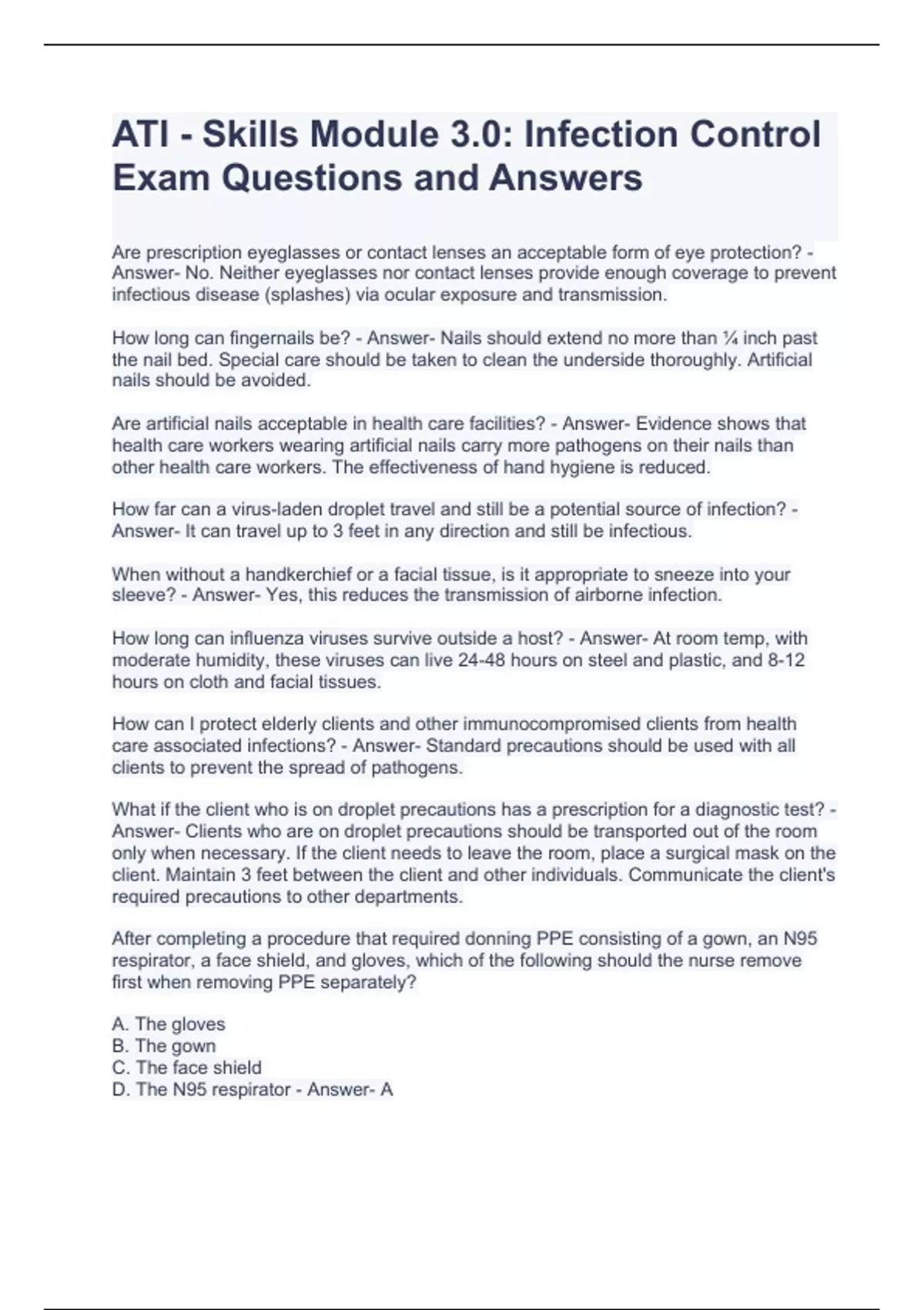 ATI - Skills Module 3.0: Infection Control Exam Questions and Answers