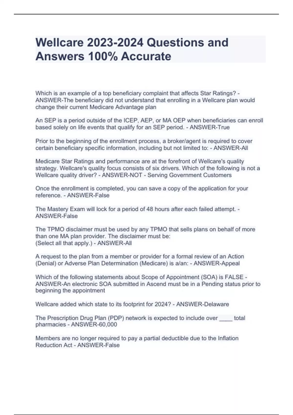 Wellcare Questions and Answers 100% Accurate Wellcare Questions and Answers 100% Accurate Wellcare Questions and Answers 100% Accurate Which is an example of a top beneficiary complaint that affects Star Ratings? - ANSWER-The beneficiary did not understand that enrolling in a Wellcare plan would change their current Medicare Advantage plan An SEP is a period outside of the ICEP, AEP, or MA OEP when beneficiaries can enroll based solely on life events that qualify for an SEP period. - ANSWER-True Prior to the beginning of the enrollment process, a broker/agent is required to cover certain beneficiary