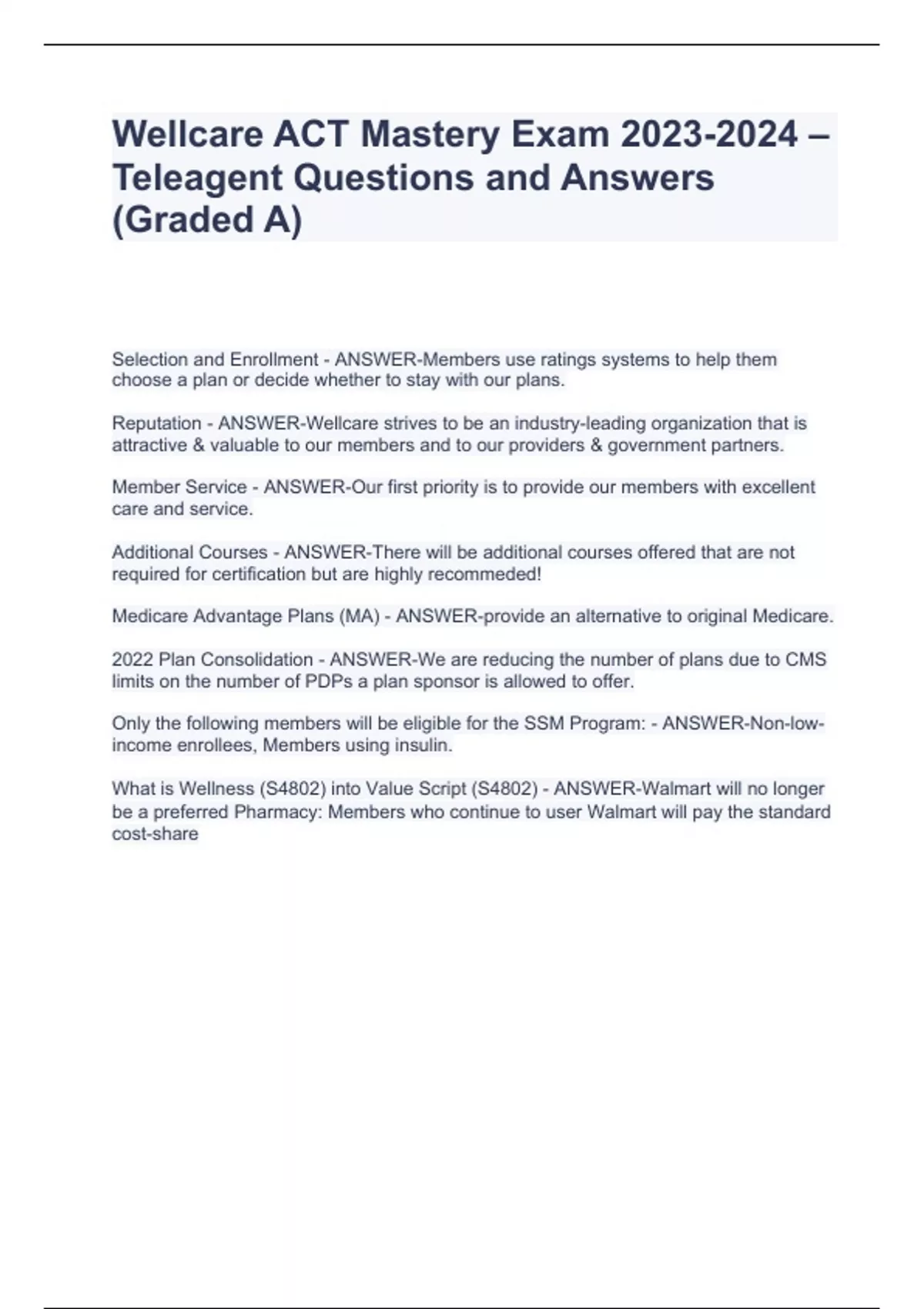 Wellcare ACT Mastery Exam – Teleagent Questions and Answers (Graded A) Wellcare ACT Mastery Exam – Teleagent Questions and Answers (Graded A) Wellcare ACT Mastery Exam – Teleagent Questions and Answers (Graded A) Wellcare ACT Mastery Exam – Teleagent Questions and Answers (Graded A) Selection and Enrollment - ANSWER-Members use ratings systems to help them choose a plan or decide whether to stay with our plans.
