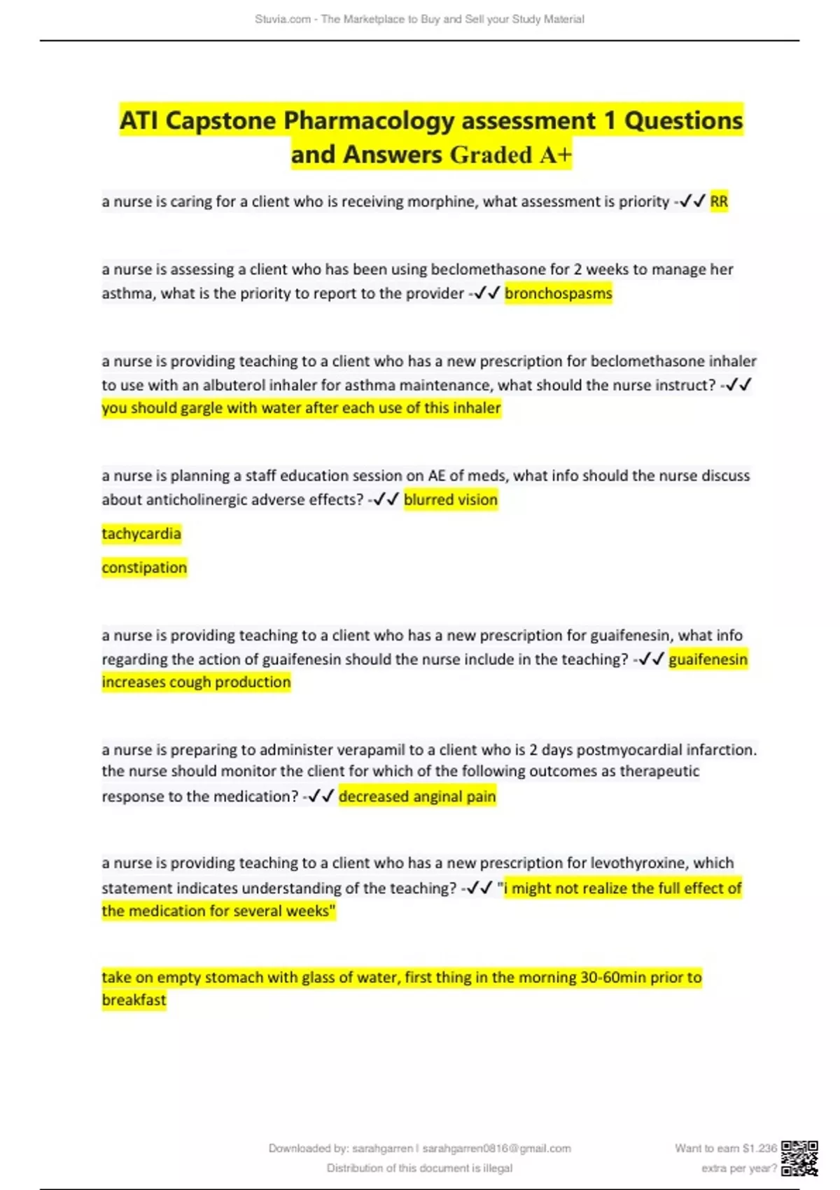 ATI Capstone Pharmacology assessment anwsers 2019 Taken in 2023