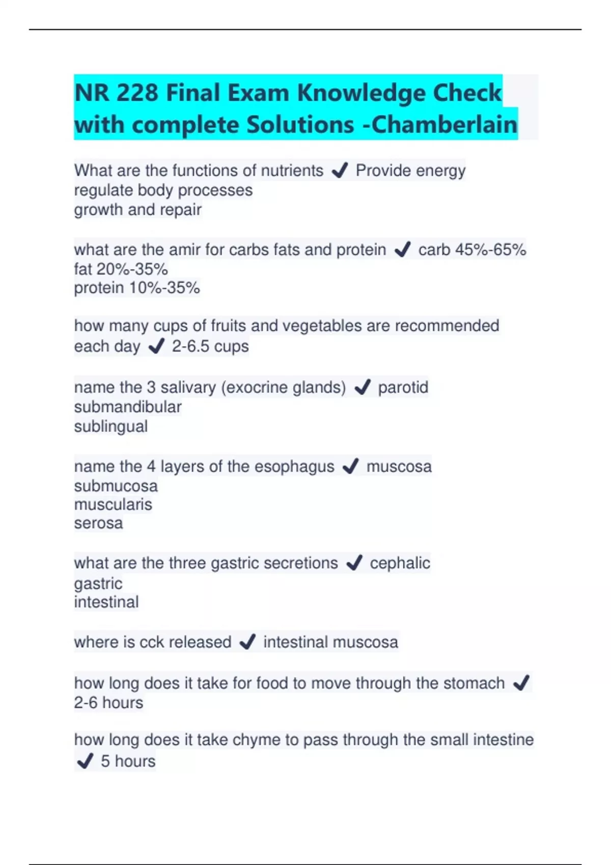 NR 228 Final Exam Knowledge Check with complete Solutions | Latest 2023/2024 -Chamberlain What are the functions of nutrients ️ Provide energy regulate body processes growth and repair what are the amir for carbs fats and protein ️ carb 45%-65% fat 20%-35% protein 10%-35% how many cups of fruits and vegetables are recommended each day ️ 2-6.5 cups name the 3 salivary (exocrine glands) ️ parotid submandibular sublingual name the 4 layers of the esophagus ️ muscosa submucosa muscularis serosa what are the three gastric secretions ️ cephalic gastric intestinal where is cck released ️ intestinal muscosa how long does it take for food to move through the stomach ️ 2-6 hours how long does it take chyme to pass through the small intestine ️ 5 hours what i