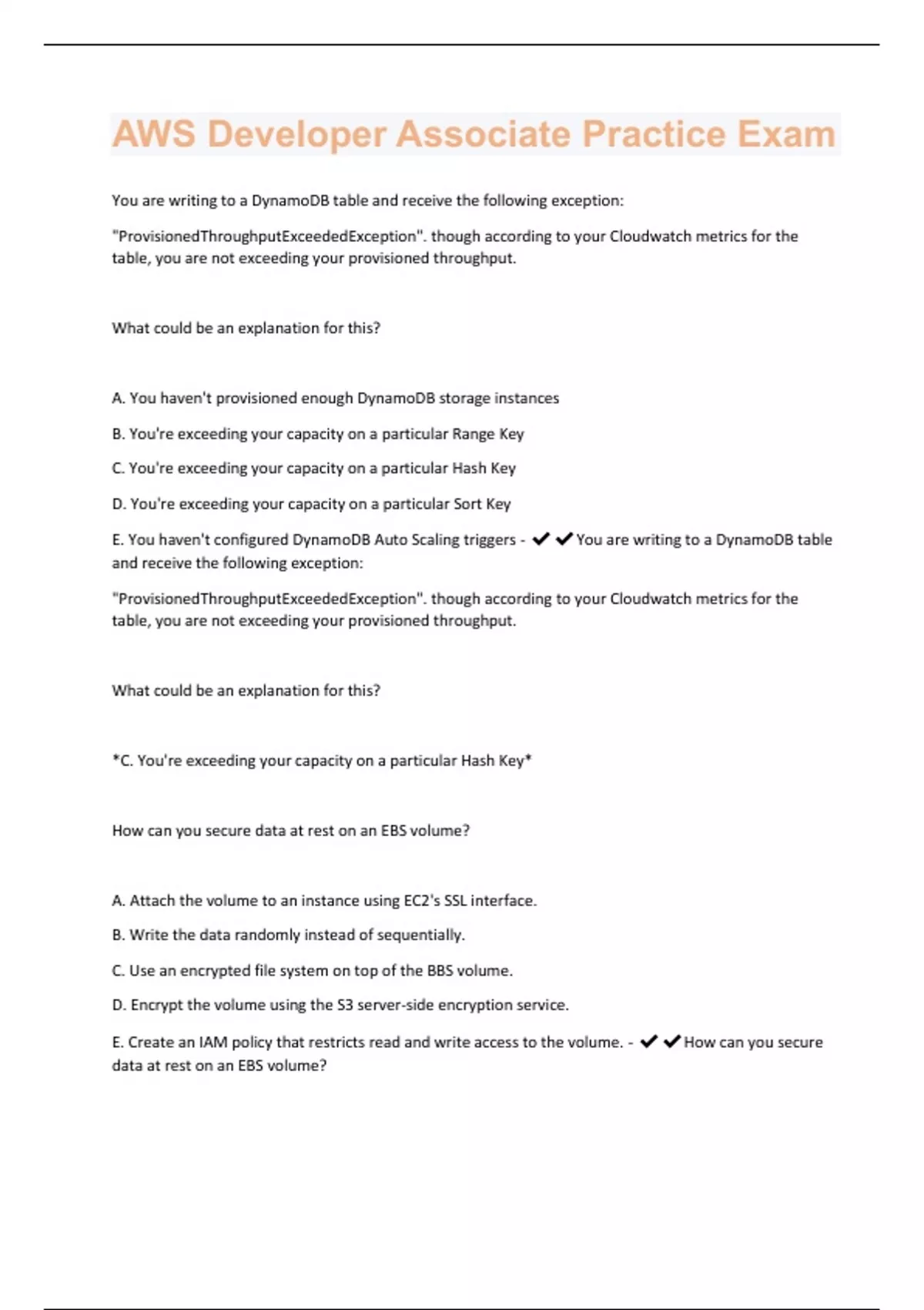 You are writing to a DynamoDB table and receive the following exception: "ProvisionedThroughputExceededException". though according to your Cloudwatch metrics for the table, you are not exceeding your provisioned throughput. What could be an explanation for this? A. You haven't provisioned enough DynamoDB storage instances B. You're exceeding your capacity on a particular Range Key C. You're exceeding your capacity on a particular Hash Key D. You're exceeding your capacity on a particular Sort Key E. You haven't configured DynamoDB Auto Scaling triggers - You are writing to a DynamoDB table and receive the following exception: "ProvisionedThroughputExceededException". though according to your Cloudwatch metrics for the table, you are not exceeding your provisioned throughput. What could be an explanation for this? *C. You're exceeding your capacity on a particular Hash Key* How can you secure data at rest on an EBS volume? A. Attach the volume to an instance using EC2's SSL interface. B. Write the data randomly instead of sequentially. C. Use an encrypted file system on top of the BBS volume. D. Encrypt the volume using the S3 server-side encryption service. E. Create an IAM policy that restricts read and write access to the volume. - How can you secure data at rest on an EBS volume?