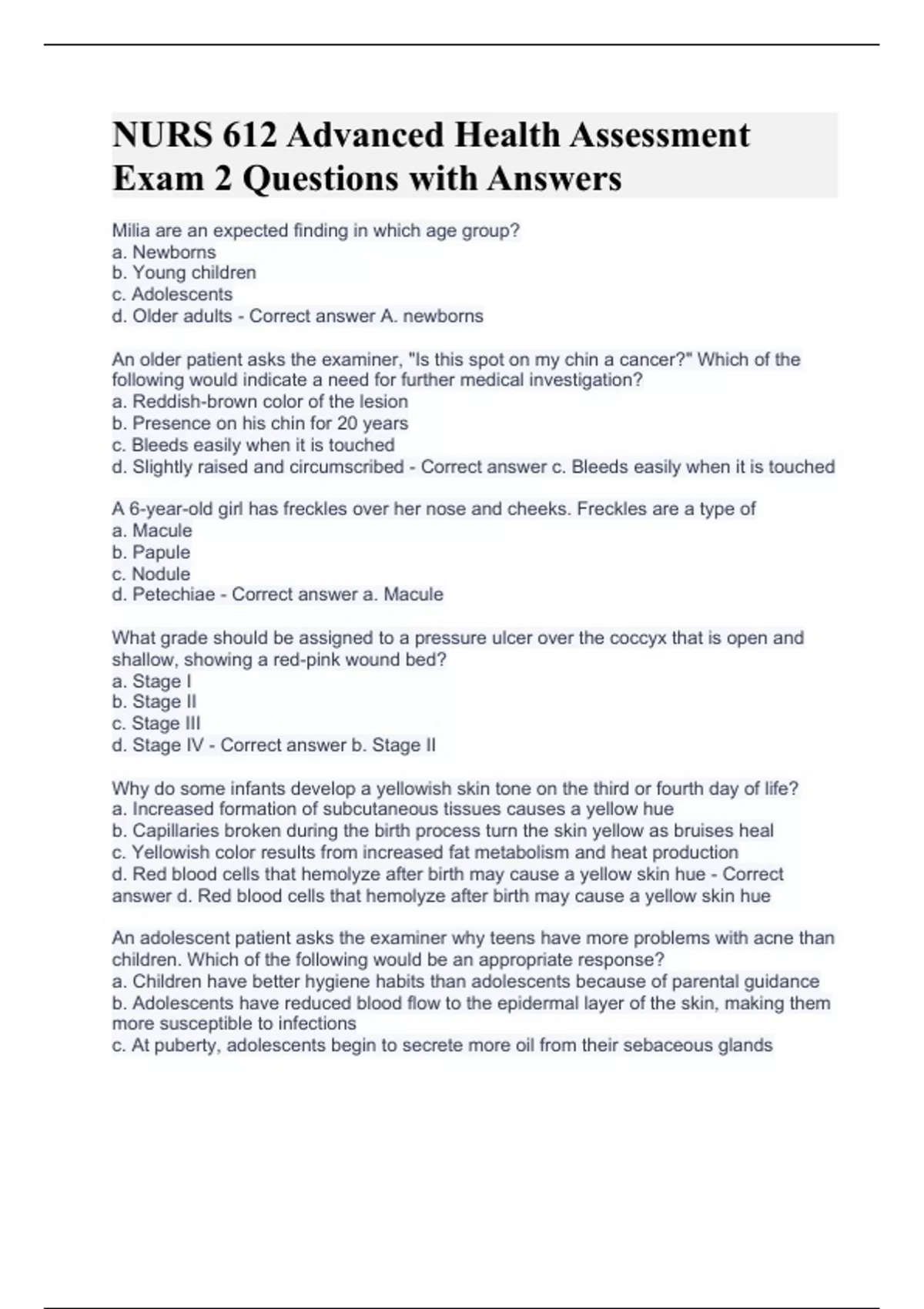 NURS 612 Advanced Health Assessment Exam 2 Questions with AnswersNURS 612 Advanced Health Assessment Exam 2 Questions with AnswersNURS 612 Advanced Health Assessment Exam 2 Questions with Answers