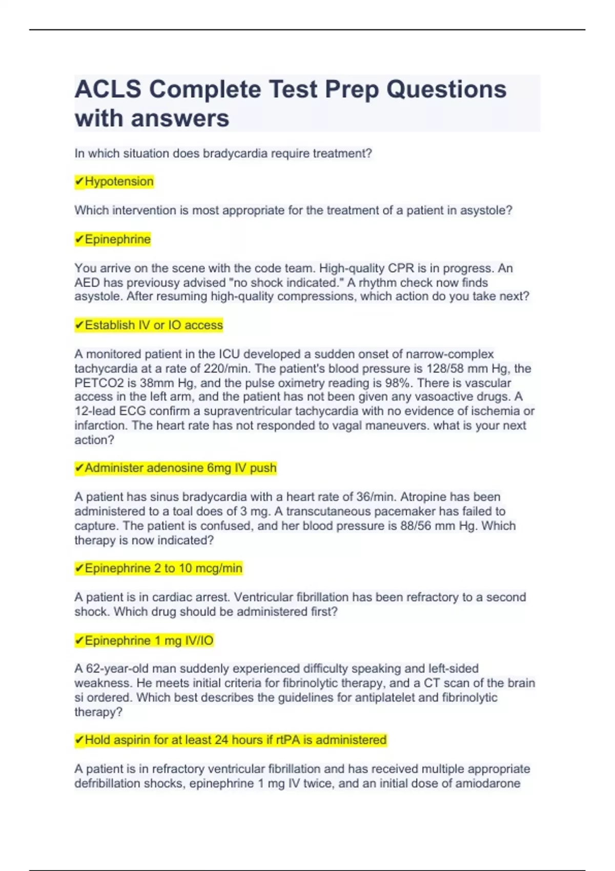 ACLS Complete Test Prep Questions with answers