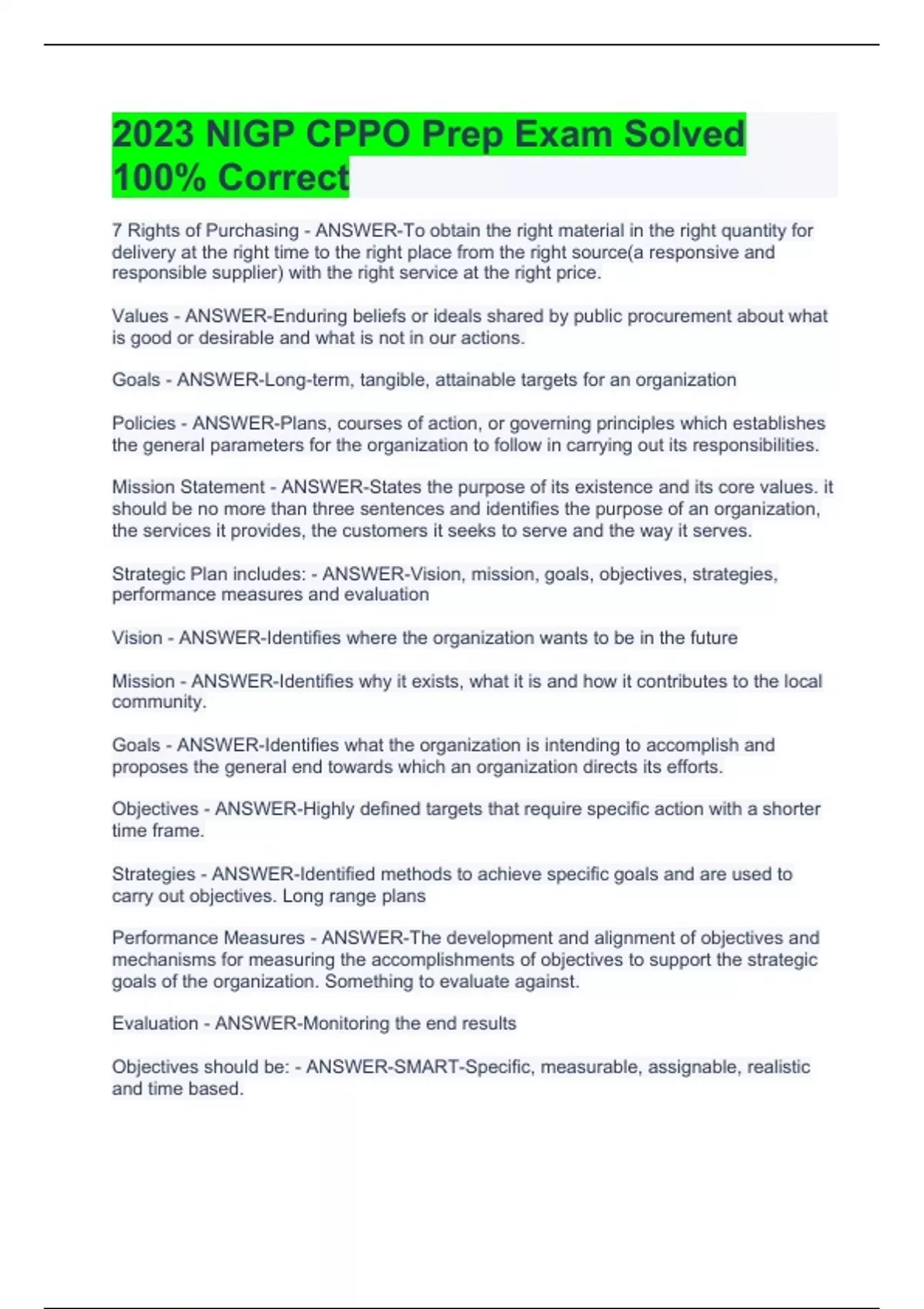 7 Rights of Purchasing - ANSWER-To obtain the right material in the right quantity for delivery at the right time to the right place from the right source(a responsive and responsible supplier) with the right service at the right price. Values - ANSWER-Enduring beliefs or ideals shared by public procurement about what is good or desirable and what is not in our actions. Goals - ANSWER-Long-term, tangible, attainable targets for an organization Policies - ANSWER-Plans, courses of action, or governing principles which establishes the general parameters for the organization to follow in carrying out its responsibilities. Mission Statement - ANSWER-States the purpose of its existence and its core values. it should be no more than three sentences and identifies the purpose of an organization, the services it provides, the customers it seeks to serve and the way it serves. Strategic Plan includes: - ANSWER-Vision, mission, goals, objectives, strategies, performance measures and evaluation Vision - ANSWER-Identifies where the organization wants to be in the future Mission - ANSWER-Identifies why it exists, what it is and how it contributes to the local community. Goals - ANSWER-Identifies what the organization is intending to accomplish and proposes the general end towards which an organization directs its efforts. Objectives - ANSWER-Highly defined targets that require specific action with a shorter time frame. Strategies - ANSWER-Identified methods to achieve specific goals and are used to carry out objectives. Long range plans Performance Measures - ANSWER-The development and alignment of objectives and mechanisms for measuring the accomplishments of objectives to support the strategic goals of the organization. Something to evaluate against. Evaluation - ANSWER-Monitoring the end results Objectives should be: - ANSWER-SMART-Specific, measurable, assignable, realistic and time based.