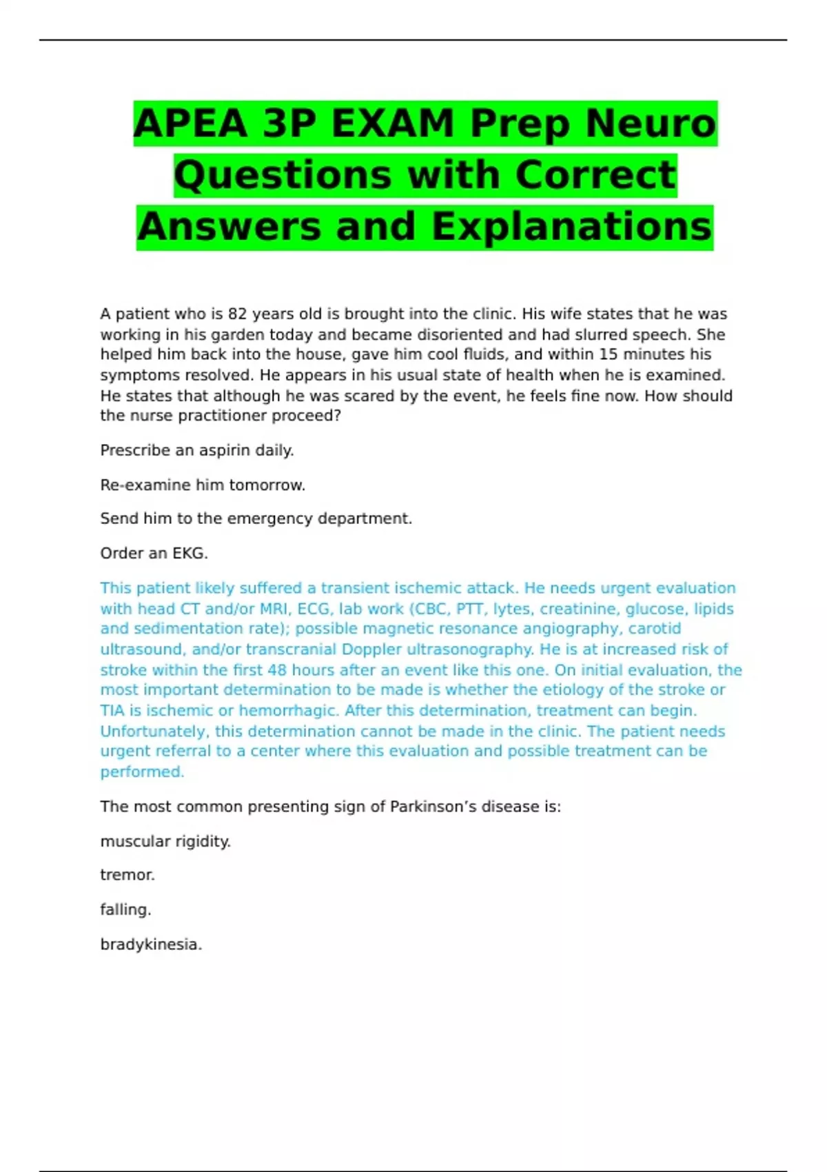 NUR 706 APEA 3P EXAM PREP NEURO QUESTIONS WITH CORRECT ANSWERS & EXPLANATIONS