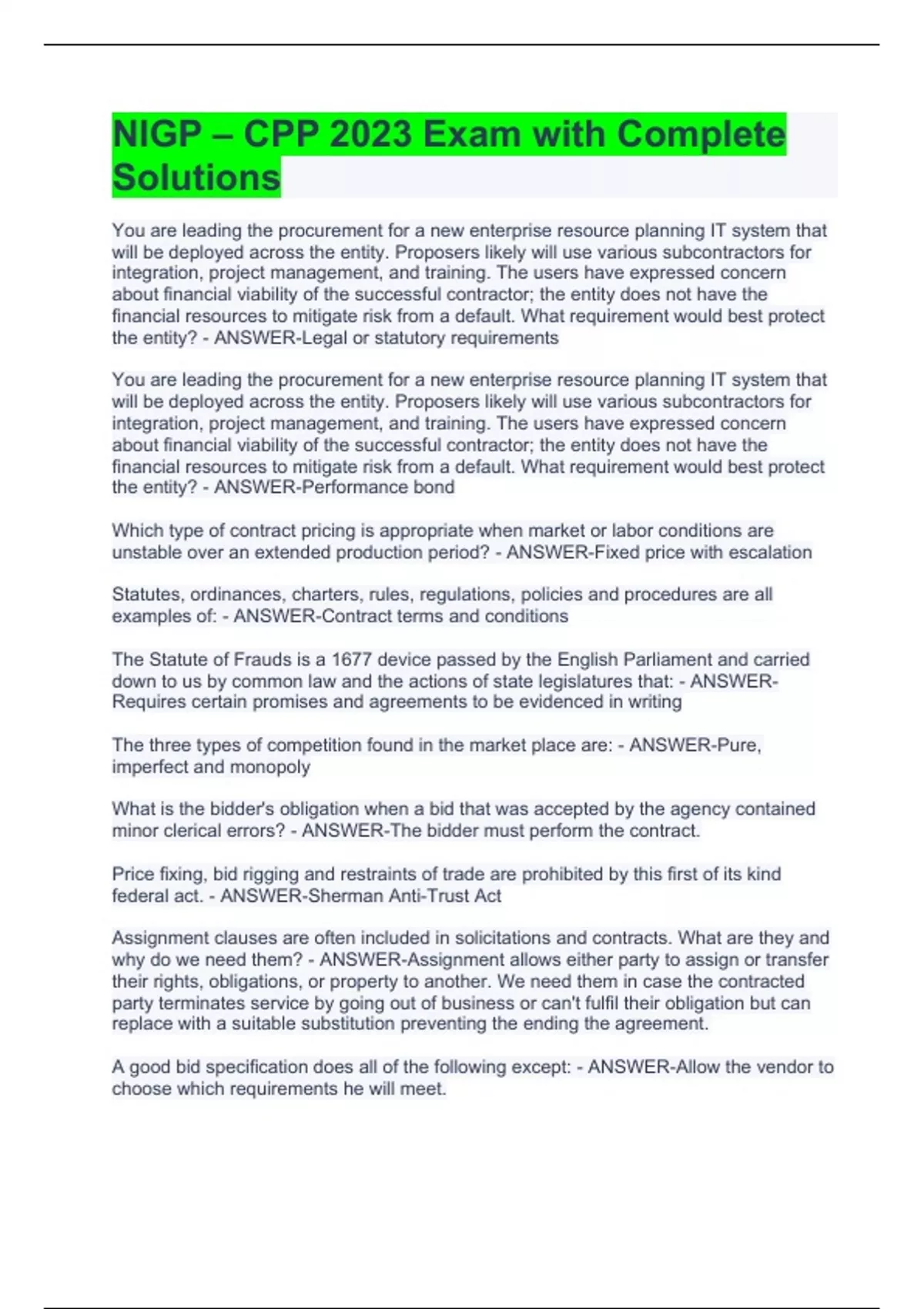 You are leading the procurement for a new enterprise resource planning IT system that will be deployed across the entity. Proposers likely will use various subcontractors for integration, project management, and training. The users have expressed concern about financial viability of the successful contractor; the entity does not have the financial resources to mitigate risk from a default. What requirement would best protect the entity? - ANSWER-Legal or statutory requirements You are leading the procurement for a new enterprise resource planning IT system that will be deployed across the entity. Proposers likely will use various subcontractors for integration, project management, and training. The users have expressed concern about financial viability of the successful contractor; the entity does not have the financial resources to mitigate risk from a default. What requirement would best protect the entity? - ANSWER-Performance bond Which type of contract pricing is appropriate when market or labor conditions are unstable over an extended production period? - ANSWER-Fixed price with escalation Statutes, ordinances, charters, rules, regulations, policies and procedures are all examples of: - ANSWER-Contract terms and conditions The Statute of Frauds is a 1677 device passed by the English Parliament and carried down to us by common law and the actions of state legislatures that: - ANSWER-Requires certain promises and agreements to be evidenced in writing The three types of competition found in the market place are: - ANSWER-Pure, imperfect and monopoly What is the bidder's obligation when a bid that was accepted by the agency contained minor clerical errors? - ANSWER-The bidder must perform the contract. Price fixing, bid rigging and restraints of trade are prohibited by this first of its kind federal act. - ANSWER-Sherman Anti-Trust Act Assignment clauses are often included in solicitations and contracts. What are they and why do we need them? - ANSWER-Assignment allows either party to assign or transfer their rights, obligations, or property to another. We need them in case the contracted party terminates service by going out of business or can't fulfil their obligation but can replace with a suitable substitution preventing the ending the agreement. A good bid specification does all of the following except: - ANSWER-Allow the vendor to choose which requirements he will meet.