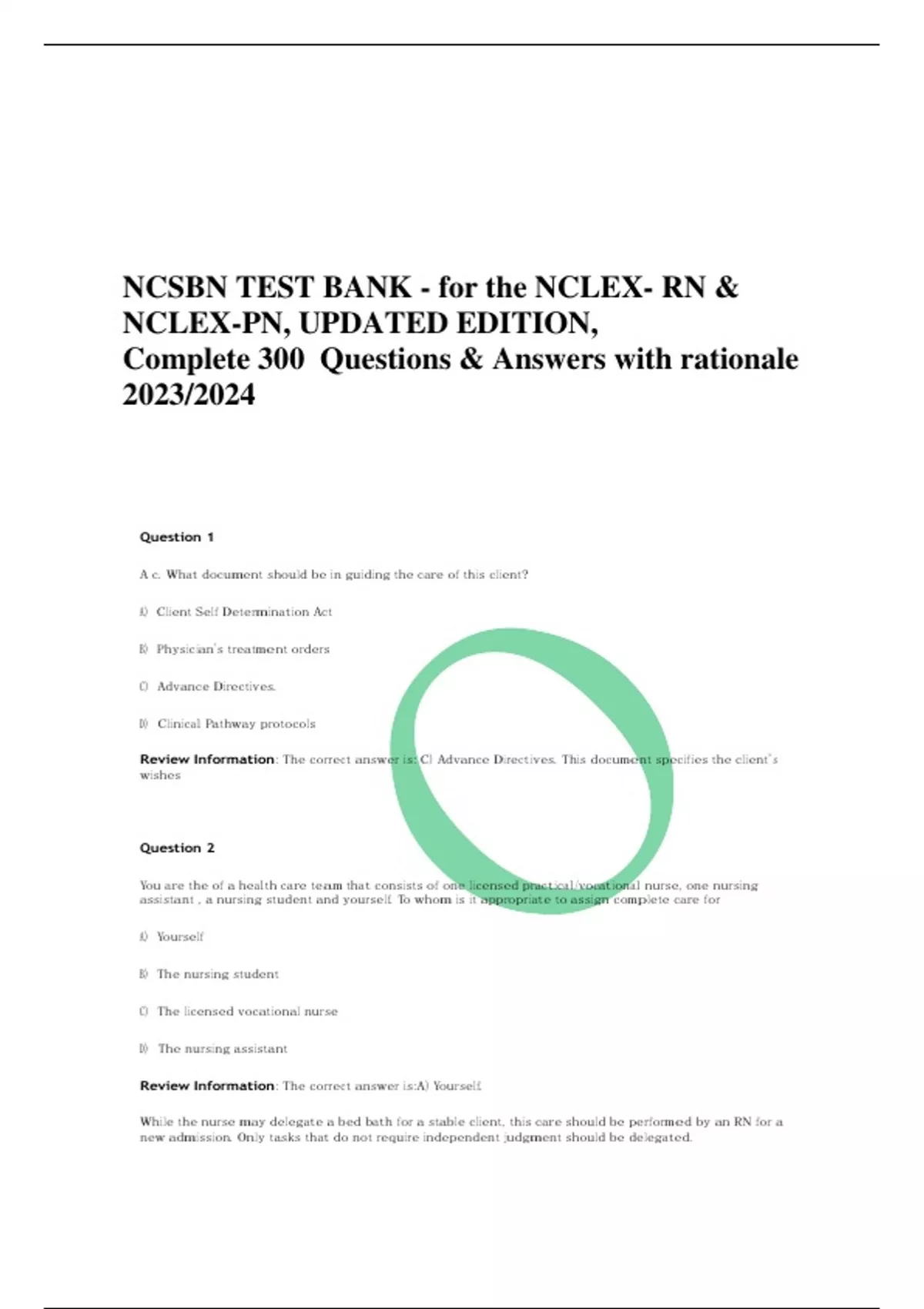 NCSBN TEST BANK - for the NCLEX- RN & NCLEX-PN, UPDATED EDITION, Complete 300 Questions & Answers with rationale 2023/2024 NCSBN TEST BANK - for the NCLEX- RN & NCLEX-PN, UPDATED EDITION, Complete 300 Questions & Answers with rationale 2023/2024 Question 1 A c. What document should be in guiding the care of this client? A) Client Self Determination Act B) Physician's treatment orders C) Advance Directives. D) Clinical Pathway protocols Review Information: The correct answer is: C) Advance Directives. This document specifies the client's wishes Question 2 You are the of a health care team that consists of one licensed practical/vocational nurse, one nursing assistant , a nursing student and yourself. To whom is it appropriate to assign complete care for A) Yourself B) The nursing student C) The licensed vocational nurse D) The nursing assistant Review Information: The correct answer is:A) Yourself. While the nurse may delegate a bed bath for a stable client, this care should be performed by an RN for a new admission. Only tasks that do not require independent judgment should be delegated.