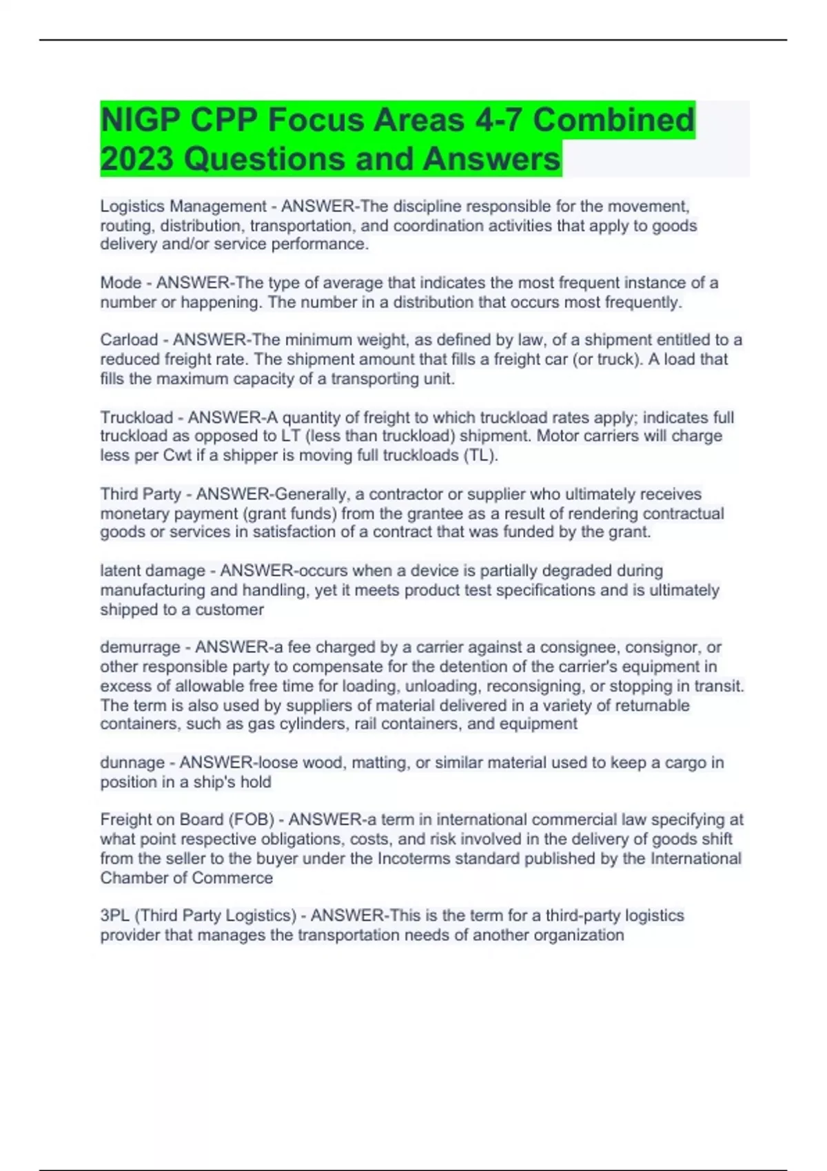 Logistics Management - ANSWER-The discipline responsible for the movement, routing, distribution, transportation, and coordination activities that apply to goods delivery and/or service performance. Mode - ANSWER-The type of average that indicates the most frequent instance of a number or happening. The number in a distribution that occurs most frequently. Carload - ANSWER-The minimum weight, as defined by law, of a shipment entitled to a reduced freight rate. The shipment amount that fills a freight car (or truck). A load that fills the maximum capacity of a transporting unit. Truckload - ANSWER-A quantity of freight to which truckload rates apply; indicates full truckload as opposed to LT (less than truckload) shipment. Motor carriers will charge less per Cwt if a shipper is moving full truckloads (TL). Third Party - ANSWER-Generally, a contractor or supplier who ultimately receives monetary payment (grant funds) from the grantee as a result of rendering contractual goods or services in satisfaction of a contract that was funded by the grant. latent damage - ANSWER-occurs when a device is partially degraded during manufacturing and handling, yet it meets product test specifications and is ultimately shipped to a customer demurrage - ANSWER-a fee charged by a carrier against a consignee, consignor, or other responsible party to compensate for the detention of the carrier's equipment in excess of allowable free time for loading, unloading, reconsigning, or stopping in transit. The term is also used by suppliers of material delivered in a variety of returnable containers, such as gas cylinders, rail containers, and equipment dunnage - ANSWER-loose wood, matting, or similar material used to keep a cargo in position in a ship's hold Freight on Board (FOB) - ANSWER-a term in international commercial law specifying at what point respective obligations, costs, and risk involved in the delivery of goods shift from the seller to the buyer under the Incoterms standard published by the International Chamber of Commerce 3PL (Third Party Logistics) - ANSWER-This is the term for a third-party logistics provider that manages the transportation needs of another organization