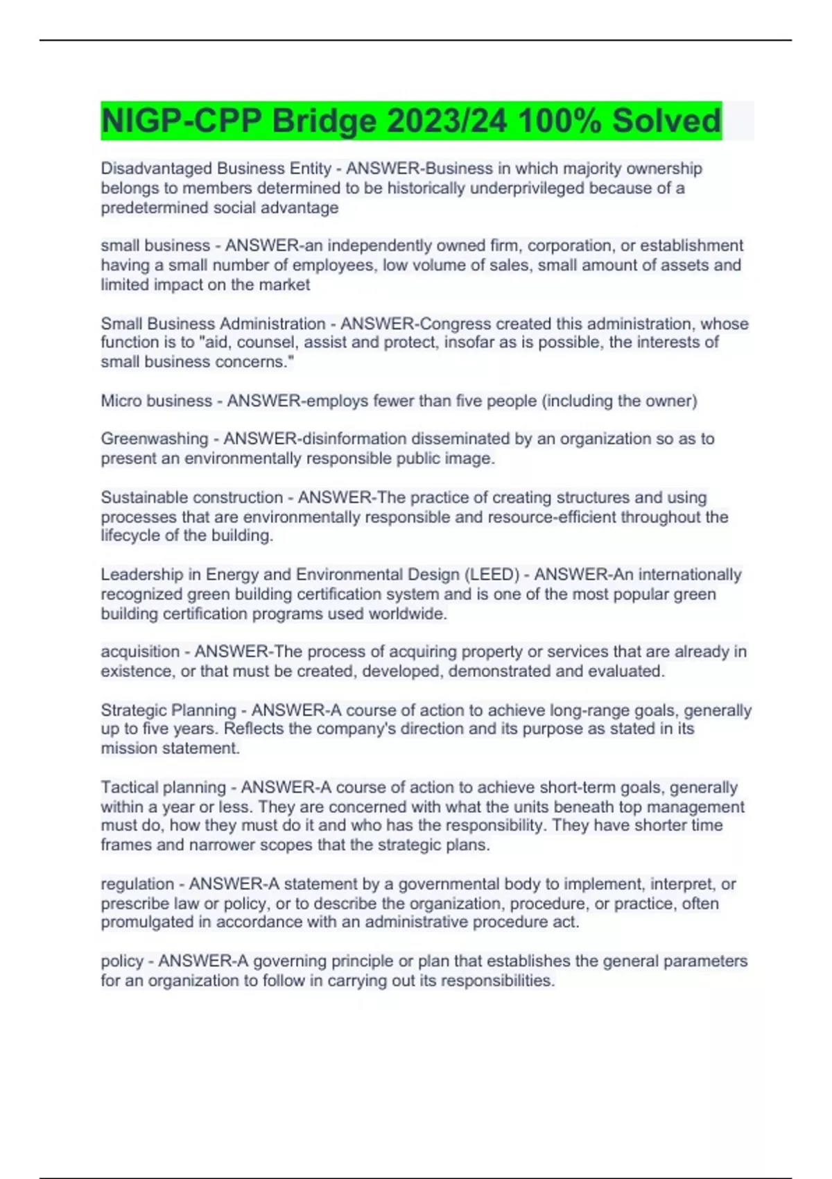 Disadvantaged Business Entity - ANSWER-Business in which majority ownership belongs to members determined to be historically underprivileged because of a predetermined social advantage small business - ANSWER-an independently owned firm, corporation, or establishment having a small number of employees, low volume of sales, small amount of assets and limited impact on the market Small Business Administration - ANSWER-Congress created this administration, whose function is to "aid, counsel, assist and protect, insofar as is possible, the interests of small business concerns." Micro business - ANSWER-employs fewer than five people (including the owner) Greenwashing - ANSWER-disinformation disseminated by an organization so as to present an environmentally responsible public image. Sustainable construction - ANSWER-The practice of creating structures and using processes that are environmentally responsible and resource-efficient throughout the lifecycle of the building. Leadership in Energy and Environmental Design (LEED) - ANSWER-An internationally recognized green building certification system and is one of the most popular green building certification programs used worldwide. acquisition - ANSWER-The process of acquiring property or services that are already in existence, or that must be created, developed, demonstrated and evaluated. Strategic Planning - ANSWER-A course of action to achieve long-range goals, generally up to five years. Reflects the company's direction and its purpose as stated in its mission statement. Tactical planning - ANSWER-A course of action to achieve short-term goals, generally within a year or less. They are concerned with what the units beneath top management must do, how they must do it and who has the responsibility. They have shorter time frames and narrower scopes that the strategic plans. regulation - ANSWER-A statement by a governmental body to implement, interpret, or prescribe law or policy, or to describe the organization, procedure, or practice, often promulgated in accordance with an administrative procedure act. policy - ANSWER-A governing principle or plan that establishes the general parameters for an organization to follow in carrying out its responsibilities.