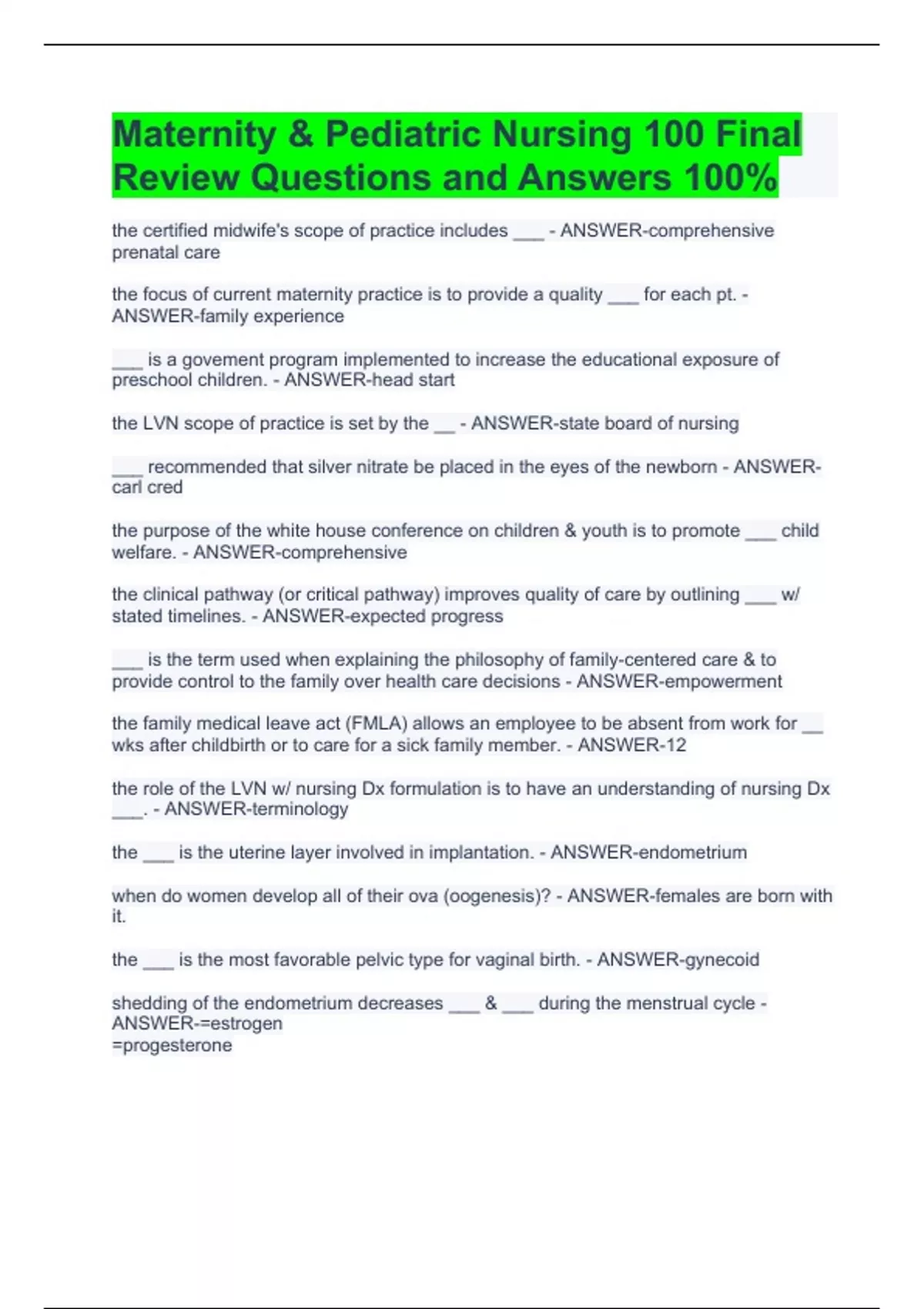 the certified midwife's scope of practice includes ___ - ANSWER-comprehensive prenatal care the focus of current maternity practice is to provide a quality ___ for each pt. - ANSWER-family experience ___ is a govement program implemented to increase the educational exposure of preschool children. - ANSWER-head start the LVN scope of practice is set by the __ - ANSWER-state board of nursing ___ recommended that silver nitrate be placed in the eyes of the newborn - ANSWER-carl cred the purpose of the white house conference on children & youth is to promote ___ child welfare. - ANSWER-comprehensive the clinical pathway (or critical pathway) improves quality of care by outlining ___ w/ stated timelines. - ANSWER-expected progress ___ is the term used when explaining the philosophy of family-centered care & to provide control to the family over health care decisions - ANSWER-empowerment the family medical leave act (FMLA) allows an employee to be absent from work for __ wks after childbirth or to care for a sick family member. - ANSWER-12 the role of the LVN w/ nursing Dx formulation is to have an understanding of nursing Dx ___. - ANSWER-terminology the ___ is the uterine layer involved in implantation. - ANSWER-endometrium when do women develop all of their ova (oogenesis)? - ANSWER-females are born with it. the ___ is the most favorable pelvic type for vaginal birth. - ANSWER-gynecoid shedding of the endometrium decreases ___ & ___ during the menstrual cycle - ANSWER-=estrogen =progesterone when secondary sex characteristics, such as pubic hair, appear, the child is considered to have entered ___. - ANSWER-puberty ___ are fingerlike projections that "capture" the ovum - ANSWER-fimbriae absence of sperm in ejaculate characterizes ___ - ANSWER-nocturnal emission sperm remain viable in the female reproductive tract for ___ - ANSWER-4 days if a sperm carrying a ___ chromosome fertilizes the ovum, the baby will be a boy. - ANSWER-Y the ___ carries blood to the fetus. - ANSWER-umbilical vain the infant's heart begins to pump blood by the end of week ___. - ANSWER-3 if pregnant w/ dizygotic twins, the ultrasound will show two ___ & two __. - ANSWER-=placenta =amnion taking folic acid is known to prevent ___ - ANSWER-neuro tube defect the ___ in the fetal body develops into muscle. - ANSWER-mesoderm the pregnant woman tells the nurse that she has a 2yr old & has had one spontaneous abortion. the TPALM would be charted as: Gravida __, para __. - ANSWER-=3 =10110 the cause of Chadwick's signs is ___ in the pelvic area. - ANSWER-vascular congestion the normal fetal heart rate at 37wk gestation is ___ - ANSWER-110-160 a Positive indication pregnancy is the ___. - ANSWER-fetal heart beat the baby's movement can first be felt by the mother around __ or __ month - ANSWER-4-5 the softening of the cervix & vagina is described as the ___ sign - ANSWER-Goodell's the pregnant woman who is not immune to rubella should be vaccinated when? - ANSWER-after delivery & before d/c home at 37wks of gestation the pregnant woman c/o feeling dizzy while on her back, most likely caused by ___ syndrome. - ANSWER-supine hypotension