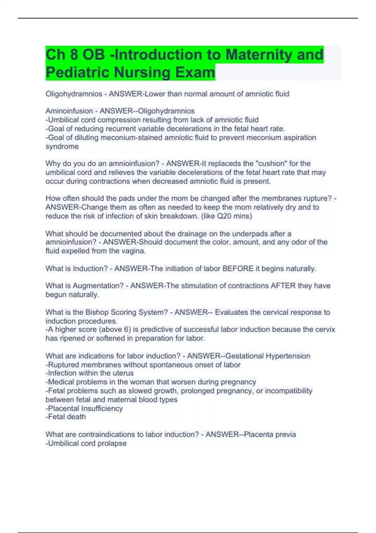 Oligohydramnios - ANSWER-Lower than normal amount of amniotic fluid Aminoinfusion - ANSWER--Oligohydramnios -Umbilical cord compression resulting from lack of amniotic fluid -Goal of reducing recurrent variable decelerations in the fetal heart rate. -Goal of diluting meconium-stained amniotic fluid to prevent meconium aspiration syndrome Why do you do an amnioinfusion? - ANSWER-It replaceds the "cushion" for the umbilical cord and relieves the variable decelerations of the fetal heart rate that may occur during contractions when decreased amniotic fluid is present. How often should the pads under the mom be changed after the membranes rupture? - ANSWER-Change them as often as needed to keep the mom relatively dry and to reduce the risk of infection of skin breakdown. (like Q20 mins) What should be documented about the drainage on the underpads after a amnioinfusion? - ANSWER-Should document the color, amount, and any odor of the fluid expelled from the vagina. What is Induction? - ANSWER-The initiation of labor BEFORE it begins naturally. What is Augmentation? - ANSWER-The stimulation of contractions AFTER they have begun naturally. What is the Bishop Scoring System? - ANSWER-- Evaluates the cervical response to induction procedures. -A higher score (above 6) is predictive of successful labor induction because the cervix has ripened or softened in preparation for labor. What are indications for labor induction? - ANSWER--Gestational Hypertension -Ruptured membranes without spontaneous onset of labor -Infection within the uterus -Medical problems in the woman that worsen during pregnancy -Fetal problems such as slowed growth, prolonged pregnancy, or incompatibility between fetal and maternal blood types -Placental Insufficiency -Fetal death What are contraindications to labor induction? - ANSWER--Placenta previa -Umbilical cord prolapse