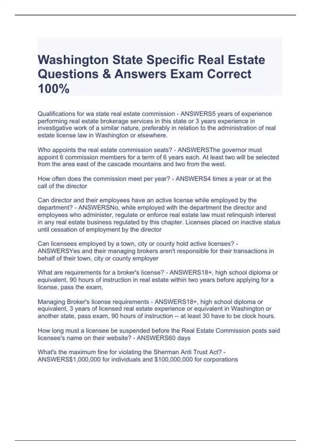Qualifications for wa state real estate commission - ANSWERS5 years of experience performing real estate brokerage services in this state or 3 years experience in investigative work of a similar nature, preferably in relation to the administration of real estate license law in Washington or elsewhere. Who appoints the real estate commission seats? - ANSWERSThe governor must appoint 6 commission members for a term of 6 years each. At least two will be selected from the area east of the cascade mountains and two from the west. How often does the commission meet per year? - ANSWERS4 times a year or at the call of the director Can director and their employees have an active license while employed by the department? - ANSWERSNo, while employed with the department the director and eWashington State Specific Real Estate Questions & Answers Exam Correct 100%c Real Estate Questions & Answers Exam Correct 100%