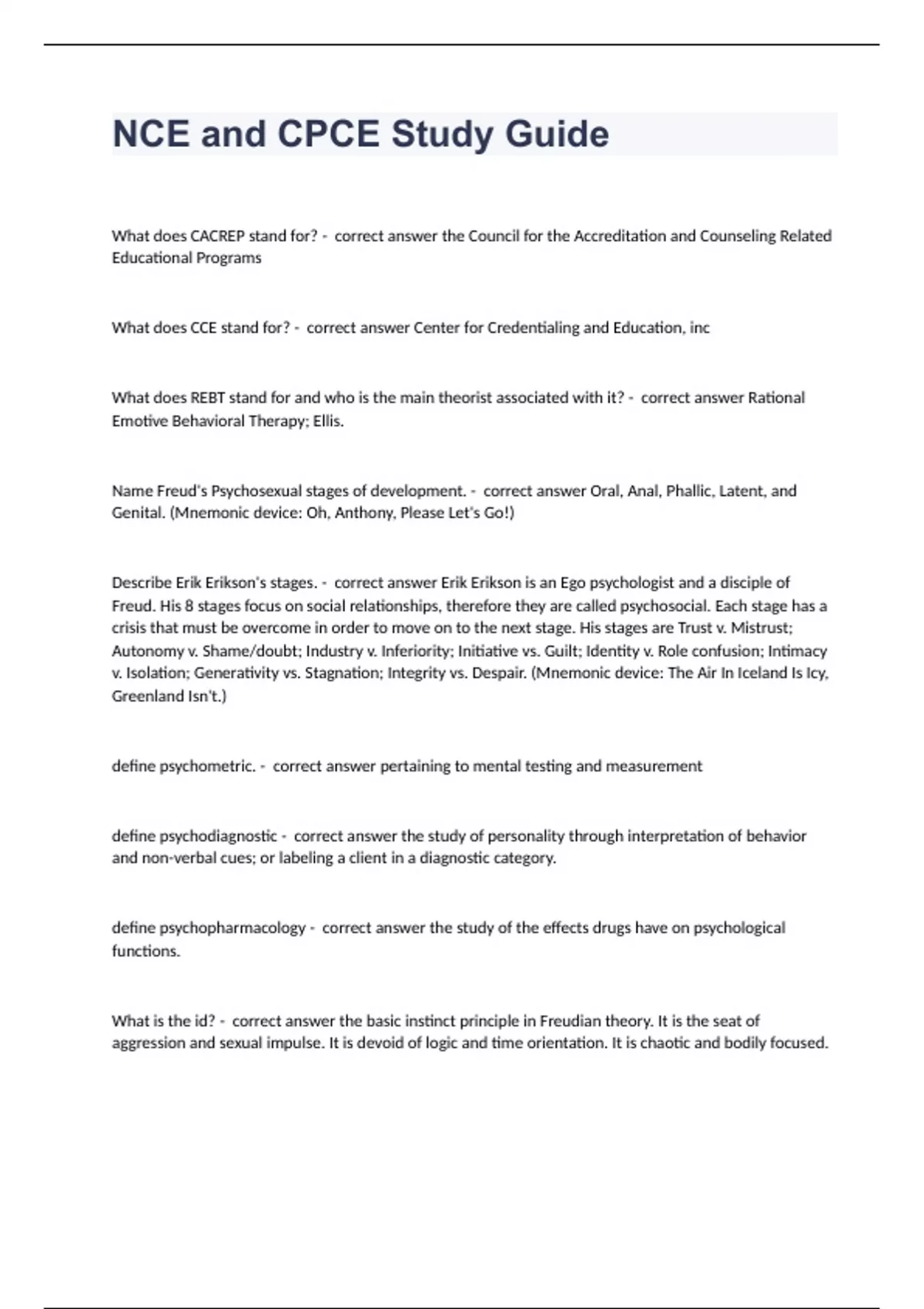 NCE and CPCE Study GuideWhat does CACREP stand for? - correct answer the Council for the Accreditation and Counseling Related Educational Programs What does CCE stand for? - correct answer Center for Credentialing and Education, inc What does REBT stand for and who is the main theorist associated with it? - correct answer Rational Emotive Behavioral Therapy; Ellis. Name Freud's Psychosexual stages of development. - correct answer Oral, Anal, Phallic, Latent, and Genital. (Mnemonic device: Oh, Anthony, Please Let's Go!) Describe Erik Erikson's stages. - correct answer Erik Erikson is an Ego psychologist and a disciple of Freud. His 8 stages focus on social relationships, therefore they are called psychosocial. Each stage has a crisis that must be overcome in order to move on to the next stage. His stages are Trust v. Mistrust; Autonomy v. Shame/doubt; Industry v. Inferiority; Initiative vs. Guilt; Identity v. Role confusion; Intimacy v. Isolation; Generativity vs. Stagnation; Integrity vs. Despair. (Mnemonic device: The Air In Iceland Is Icy, Greenland Isn't.) define psychometric. - correct answer pertaining to mental testing and measurement define psychodiagnostic - correct answer the study of personality through interpretation of behavior and non-verbal cues; or labeling a client in a diagnostic category. define psychopharmacology - correct answer the study of the effects drugs have on psychological functions. What is the id? - correct answer the basic instinct principle in Freudian theory. It is the seat of aggression and sexual impulse. It is devoid of logic and time orientation. It is chaotic and bodily focused. What is the ego? - correct answer this is the reality principle in Freudian theory. It indicates power of reasoning and control over behavior. It helps keep the impulses of the id in check. What is the superego? - correct answer the superego is the moralistic and idealistic principle in the Freudian theory. Which group of theorists believe "if you can't measure it, it doesn't exist"? - correct answer Behaviorists. They focus on O.O.B. The observable, objective behaviors. (My AP psych teacher in HS called it the O.O.B. tampon. gross, but it helped me remember it!) Who is the only psychoanalyst with a developmental theory that covered the entire lifespan? - correct answer Erik Erikson's Psychosocial stages covered the entire lifespan. Each stage has a crisis or turning point. What theory is A. A. Brill associated with? - correct answer Career theory Milton H. Erickson is associated with... - correct answer Brief psychotherapy and hypnosis. What field is Jean Piaget associated with? - correct answer Cognitive Child Development Who is Jay Haley and what is the nature of his contribution to counseling? - correct answer Haley is most famous for his work on strategic and problem-solving therapy, more specifically with his use of the paradox technique. He also studied with Milton Erickson. Arnold Lazarus - correct answer He is a known behavioral therapist who worked specifically with methods of desensitization and phobias. He is most associated with Multimodal Therapy. William Perry - correct answer He is known for his work in adult cognitive development, specifically with college students. He worked a lot with the concept of "dualistic thinking" among college students, where everything is either black or white. (Memory technique: think of Katy Perry's song Hot and Cold to associate Perry with dualism.)