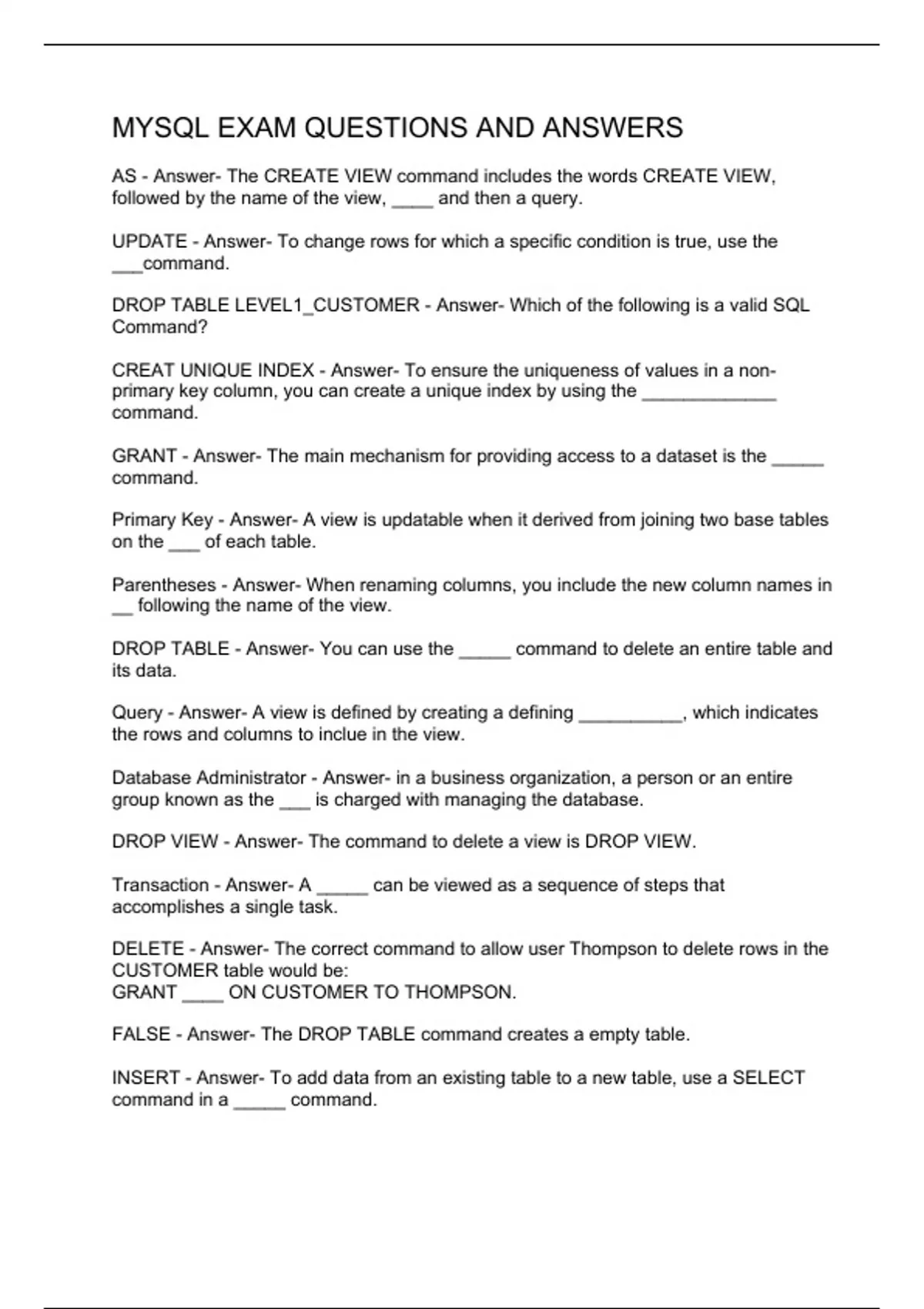 AS - Answer- The CREATE VIEW command includes the words CREATE VIEW, followed by the name of the view, ____ and then a query. UPDATE - Answer- To change rows for which a specific condition is true, use the ___command. DROP TABLE LEVEL1_CUSTOMER - Answer- Which of the following is a valid SQL Command? CREAT UNIQUE INDEX - Answer- To ensure the uniqueness of values in a non-primary key column, you can create a unique index by using the _____________ command. GRANT - Answer- The main mechanism for providing access to a dataset is the _____ command. Primary Key - Answer- A view is updatable when it derived from joining two base tables on the ___ of each table. Parentheses - Answer- When renaming columns, you include the new column names in __ following the name of the view. DROP TABLE - Answer- You can use the _____ command to delete an entire table and its data. Query - Answer- A view is defined by creating a defining __________, which indicates the rows and columns to inclue in the view. Database Administrator - Answer- in a business organization, a person or an entire group known as the ___ is charged with managing the database. DROP VIEW - Answer- The command to delete a view is DROP VIEW. Transaction - Answer- A _____ can be viewed as a sequence of steps that accomplishes a single task. DELETE - Answer- The correct command to allow user Thompson to delete rows in the CUSTOM