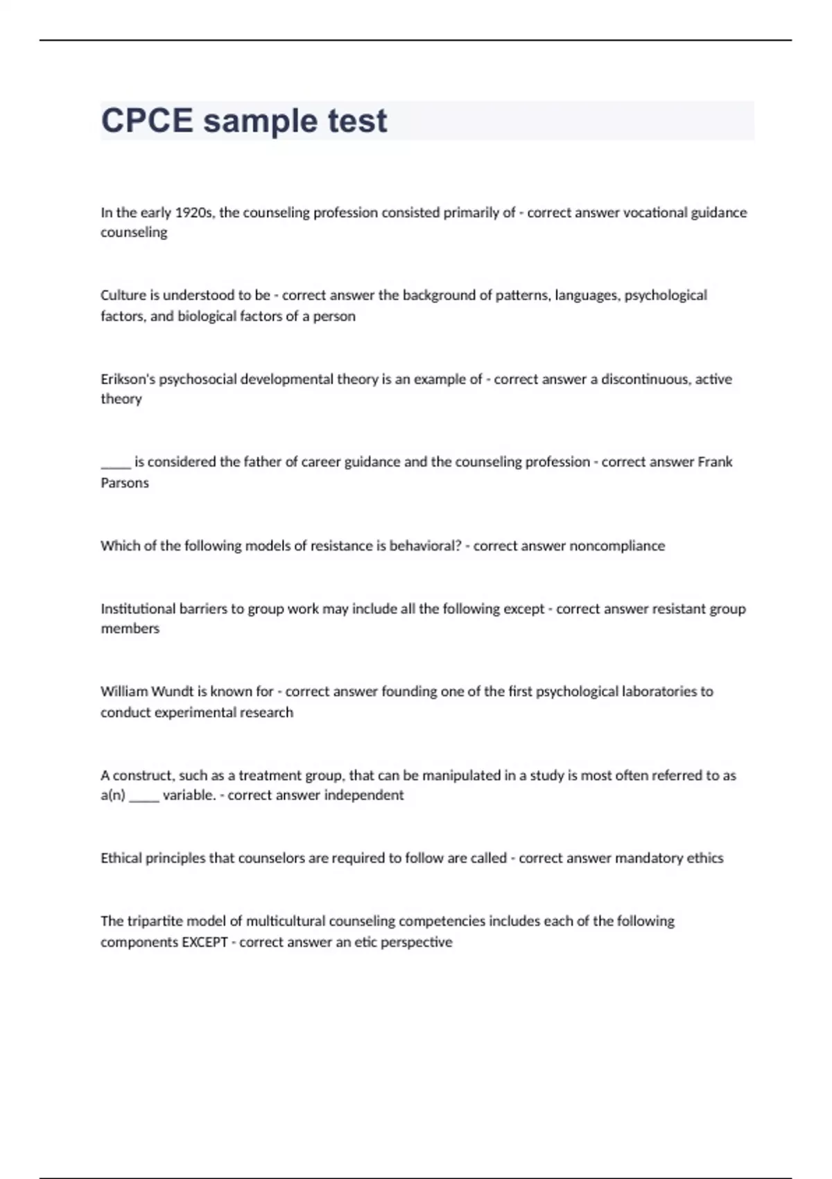 CPCE sample testIn the early 1920s, the counseling profession consisted primarily of - correct answer vocational guidance counseling Culture is understood to be - correct answer the background of patterns, languages, psychological factors, and biological factors of a person Erikson's psychosocial developmental theory is an example of - correct answer a discontinuous, active theory ____ is considered the father of career guidance and the counseling profession - correct answer Frank Parsons Which of the following models of resistance is behavioral? - correct answer noncompliance Institutional barriers to group work may include all the following except - correct answer resistant group members William Wundt is known for - correct answer founding one of the first psychological laboratories to conduct experimental research A construct, such as a treatment group, that can be manipulated in a study is most often referred to as a(n) ____ variable. - correct answer independent Ethical principles that counselors are required to follow are called - correct answer mandatory ethics The tripartite model of multicultural counseling competencies includes each of the following components EXCEPT - correct answer an etic perspective for a researcher who has limited time and a low budget, the ____ research design might be most appropriate - correct answer cross-sectional the Fair Labor Standards Act of 1938 was NOT responsible for - correct answer enforcing workplace safety and health standards A professional counselor consults with an experienced colleague about some problems she has encountered while working with a particular client. She is completely reliant on her colleague's expertise to help her move forward with her client. Which consultation model does this represent? - correct answer triadic-dependent in group work, confidentiality is - correct answer the ethical requirement of group leaders but not group members A(n) ____ does not compare an individual score to a norm group but relies on the judgment of the professional counselor to interpret the data - correct answer nonstandardized test "Whereas 1 million white swans can indicate that all swans are white, one brown swan can falsify it." That is, we can only approximate truth. This description refers to the ____ paradigm. - correct answer post-positivism Accreditation is NOT - correct answer involuntary Judging someone's worth by how closely he or she resembles European Americans is termed - correct answer colorism What part of the brain regulates emotions and motivation? - correct answer Limbic system ____ is an example of an occupation - correct answer professional counselor Observing clients' verbal and nonverbal communication and verbally conveying empathy and understanding of clients' thoughts, feelings, and behaviors are all important elements of - correct answer reflecting