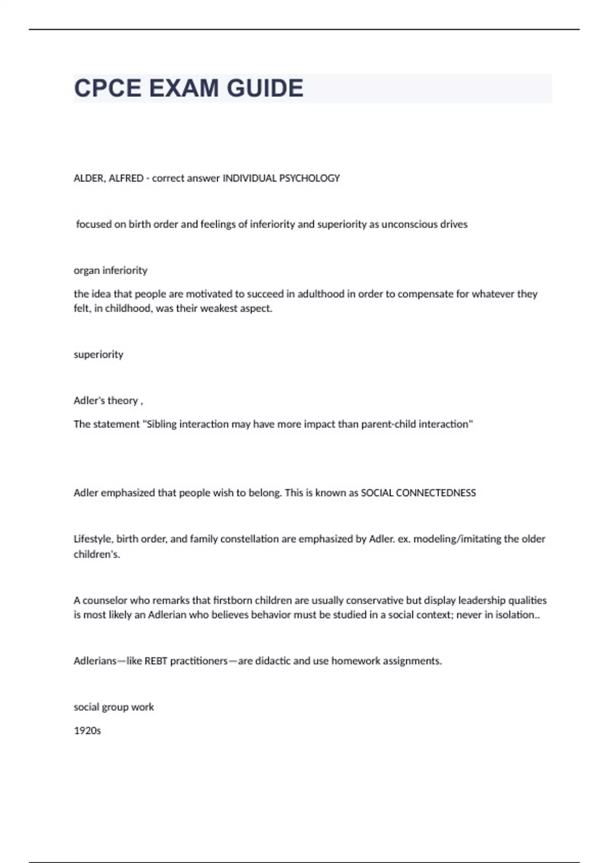 CPCE EXAM GUIDE ALDER, ALFRED - correct answer INDIVIDUAL PSYCHOLOGY focused on birth order and feelings of inferiority and superiority as unconscious drives organ inferiority the idea that people are motivated to succeed in adulthood in order to compensate for whatever they felt, in childhood, was their weakest aspect. superiority Adler's theory , The statement "Sibling interaction may have more impact than parent-child interaction" Adler emphasized that people wish to belong. This is known as SOCIAL CONNECTEDNESS Lifestyle, birth order, and family constellation are emphasized by Adler. ex. modeling/imitating the older children's. A counselor who remarks that firstborn children are usually conservative but display leadership qualities is most likely an Adlerian who believes behavior must be studied in a social context; never in isolation.. Adlerians—like REBT practitioners—are didactic and use homework assignments. social group work 1920s BOB &BOB BB founded AA WILSON &BOB SMITH) - correct answer founded AA 1935 first self help supporrt group Bandura - correct answer social learning theory Bandura (neobehavioristic) person produces and is a product of conditioning. Observation and modeling are extremely important. BERNES, ERIC - correct answer Berne (transactional analysis) messages learned about self in childhood determine whether person is good or bad, though intervention can change this script. Transactional Analysis 3 ego states: the Child, The child ego state is characterized by youth-ful behavior and qualities such as playfulness and spontaneity, called the natural child, and obedience and inhibition, called the adapted child. the Adult, The adult ego state is char-acterized by rational thought and the absence of emotions in decision making. the Parent. either criticism or nurturance of others and is often based on people's experiences with their parents when they were growing up and what they learned about how people should and should not behave. The Parent ego state has been likened to Freud's superego. The focus of TA is on examining how clients interact with of the goals of TA is to help people learn how to function from all of their ego states.