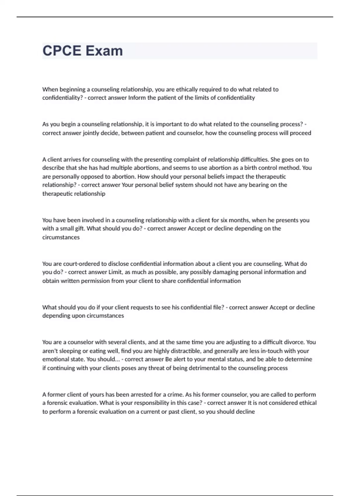 CPCE ExamWhen beginning a counseling relationship, you are ethically required to do what related to confidentiality? - correct answer Inform the patient of the limits of confidentiality As you begin a counseling relationship, it is important to do what related to the counseling process? - correct answer jointly decide, between patient and counselor, how the counseling process will proceed A client arrives for counseling with the presenting complaint of relationship difficulties. She goes on to describe that she has had multiple abortions, and seems to use abortion as a birth control method. You are personally opposed to abortion. How should your personal beliefs impact the therapeutic relationship? - correct answer Your personal belief system should not have any bearing on the therapeutic relationship You have been involved in a counseling relationship with a client for six months, when he presents you with a small gift. What should you do? - correct answer Accept or decline depending on the circumstances You are court-ordered to disclose confidential information about a client you are counseling. What do you do? - correct answer Limit, as much as possible, any possibly damaging personal information and obtain written permission from your client to share confidential information What should you do if your client requests to see his confidential file? - correct answer Accept or decline depending upon circumstances You are a counselor with several clients, and at the same time you are adjusting to a difficult divorce. You aren't sleeping or eating well, find you are highly distractible, and generally are less in-touch with your emotional state. You should... - correct answer Be alert to your mental status, and be able to determine if continuing with your clients poses any threat of being detrimental to the counseling process A former client of yours has been arrested for a crime. As his former counselor, you are called to perform a forensic evaluation. What is your responsibility in this case? - correct answer It is not considered ethical to perform a forensic evaluation on a current or past client, so you should decline You are the supervisor for a new counselor, and are asked to attend her wedding. Would it be ethical to do so? - correct answer Yes, you should be able to attend her wedding without a breach of ethics While involved with a research study, you learn that several of your students are using confidential material in an unethical manner. You had no prior knowledge of this, and all of your safeguards for professional practice were appropriate. Are you, as the principal researcher, responsible for the student's behavior - correct answer Yes, you are ultimately responsible When publishing research, it is important to do what two things? - correct answer Give credit to other contributors or sources, not plagiarize, and submit material to only one journal at a time When a conflict arises between the American Counseling Association (ACA) Code of Ethics and a governing authority, which takes precedence? - correct answer Ultimately the law may be adhered to over the Code of Ethics An ethics violation should NOT be reported when what two things happen? - correct answer A counselor has been retained to review another counselor who is in question; and when confidentiality rights would be violated What does multicultural/diversity counseling refer to? - correct answer Counseling that recognizes diversity and approaches beneficial to specific groups and an approach that all counselors should ethically be aware of Most ethical issues are related to - correct answer Confidentiality Only one psychoanalyst's developmental theory covers the entire lifespan. Who is he? - correct answer Erik Erikson The Id, Ego, Superego are attributed to which psychoanalyst? - correct answer Sigmund Freud What is the fourth stage of Jean Piaget's four stages - correct answer Formal Operations Identity Crisis theorist - correct answer Erik Erikson positive psychology - correct answer processes that contribute to optimal functioning/ not focusing on abnormalities Smoking habit to Sigmund Freud is what type of fixation? - correct answer Oral Fixation