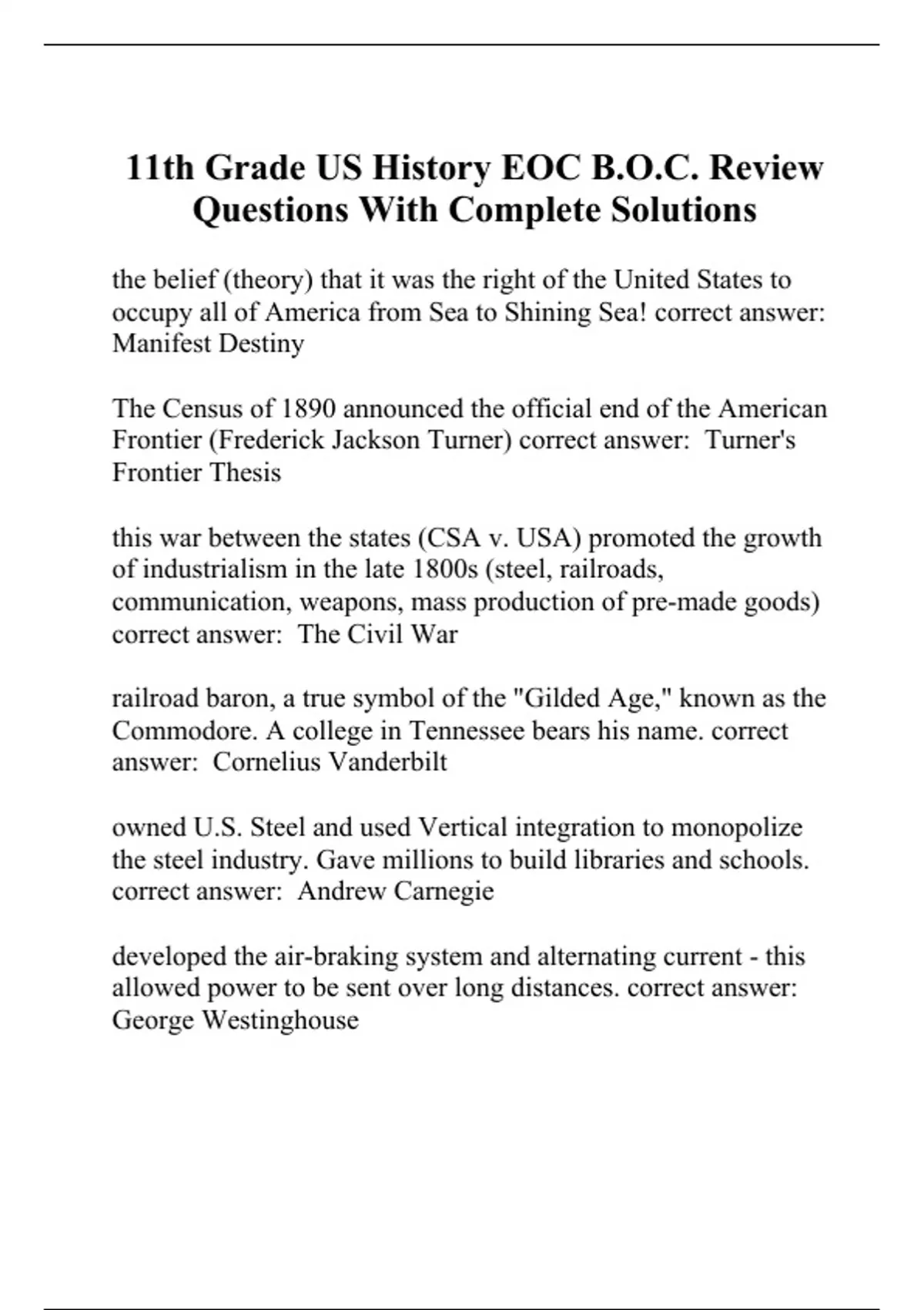11th Grade US History EOC B.O.C. Review Questions With Complete Solutions