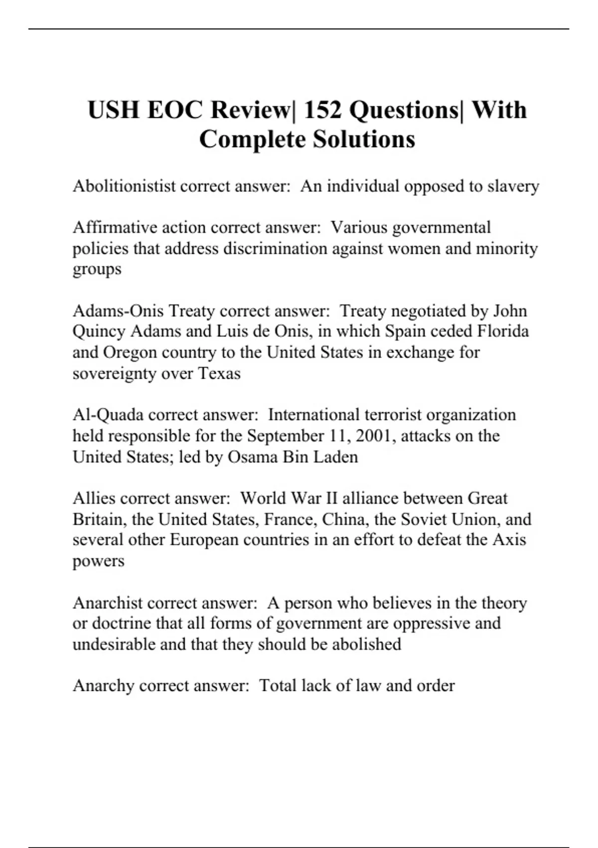 Abolitionistist correct answer: An individual opposed to slavery Affirmative action correct answer: Various governmental policies that address discrimination against women and minority groups Adams-Onis Treaty correct answer: Treaty negotiated by John Quincy Adams and Luis de Onis, in which Spain ceded Florida and Oregon country to the United States in exchange for sovereignty over Texas Al-Quada correct answer: International terrorist organization held responsible for the September 11, 2001, attacks on the United States; led by Osama Bin Laden Allies correct answer: World War II alliance between Great Britain, the United States, France, China, the Soviet Union, and several other European countries in an effort to defeat the Axis powers Anarchist correct answer: A person who believes in the theory or doctrine that all forms of government are oppressive and undesirable and that they should be abolished Anarchy correct answer: Total lack of law and order Annexed correct answer: The addition of adjacent land to increase a governed area Appomattox Court House correct answer: Location of surrender of the army of Northern Virginia to the Union Army on April 10, 1865, ending the civil war Armistice correct answer: Temporary stop in fighting; truce Articles of confederation correct answer: Initial constitution adopted by the Second Continental Congress to establish a "loose league" of individual states; replaced in 1787 by the United States Constitution Axis powers correct answer: Alliance between Germany, Italy, and Japan against the Allied nations in World War II Battles of Lexington and Concord correct answer: Early skirmishes between colonists and British troops, sparking the American Revolution Battle of Saratoga correct answer: American victory during the America Revolution that convinced France to lend aid 1777 Battle of Yorktown correct answer: Definitive victory of the