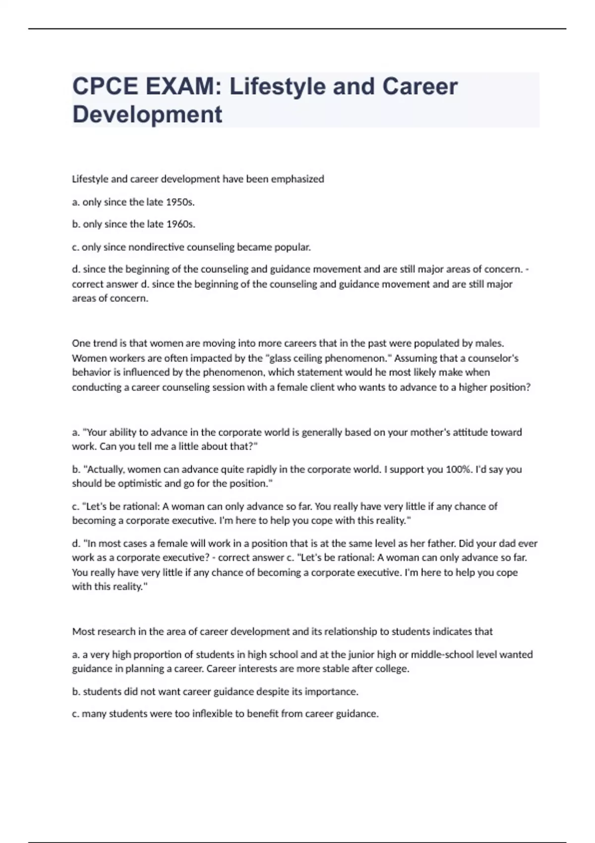 CPCE EXAM: Lifestyle and Career DevelopmentLifestyle and career development have been emphasized a. only since the late 1950s. b. only since the late 1960s. c. only since nondirective counseling became popular. d. since the beginning of the counseling and guidance movement and are still major areas of concern. - correct answer d. since the beginning of the counseling and guidance movement and are still major areas of concern. One trend is that women are moving into more careers that in the past were populated by males. Women workers are often impacted by the "glass ceiling phenomenon." Assuming that a counselor's behavior is influenced by the phenomenon, which statement would he most likely make when conducting a career counseling session with a female client who wants to advance to a higher position? a. "Your ability to advance in the corporate world is generally based on your mother's attitude toward work. Can you tell me a little about that?" b. "Actually, women can advance quite rapidly in the corporate world. I support you 100%. I'd say you should be optimistic and go for the position." c. "Let's be rational: A woman can only advance so far. You really have very little if any chance of becoming a corporate executive. I'm here to help you cope with this reality." d. "In most cases a female will work in a position that is at the same level as her father. Did your dad ever work as a corporate executive? - correct answer c. "Let's be rational: A woman can only advance so far. You really have very little if any chance of becoming a corporate executive. I'm here to help you cope with this reality." Most research in the area of career development and its relationship to students indicates that a. a very high proportion of students in high school and at the junior high or middle-school level wanted guidance in planning a career. Career interests are more stable after college. b. students did not want career guidance despite its importance. c. many students were too inflexible to benefit from career guidance.
